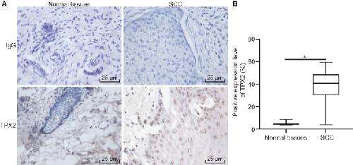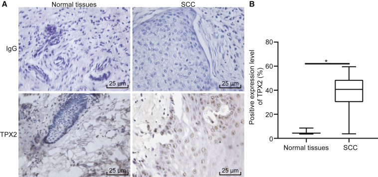 Figure 1. TPX2 Is Overexpressed in cSCC Tissues(A) Immunohistochemical staining of TPX2 in adjacent normal tissues and cSCC tissues (400Ã). (B) Quantitative analysis of positive expression level of TPX2 in adjacent normal tissues and cSCC tissues. The immunohistochemical results were expressed by measurement data and analyzed by the chi-square test. N = 40. *p < 0.05 versus the adjacent normal tissues.