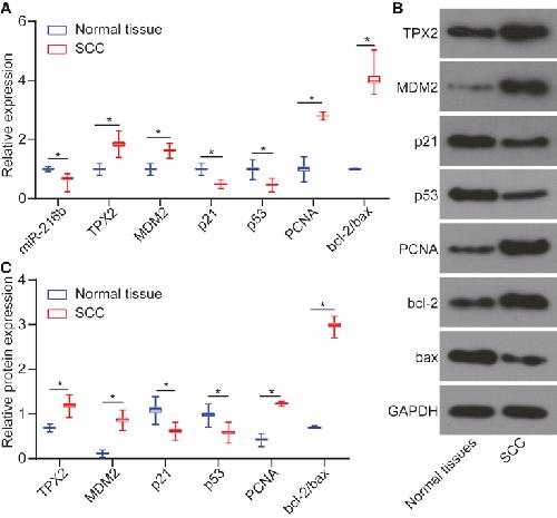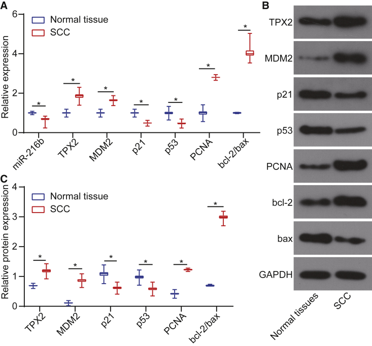 Figure 2. miR-216b Is Poorly Expressed in cSCC Tissues(A) miR-216b expression and mRNA levels of TPX2, MDM2, p21, p53, PCNA, and bcl-2/bax in cSCC tissues and adjacent normal tissues determined by qRT-PCR. (B) Western blots of TPX2, MDM2, p21, p53, PCNA, and bcl-2/bax in cSCC tissues and adjacent normal tissues normalized to GAPDH. (C) Protein expressions of TPX2, MDM2, p21, p53, PCNA, and bcl-2/bax in cSCC tissues and adjacent normal tissues determined by western blot analysis. Data were expressed as mean ± standard deviation, and data among multiple groups were compared by one-way ANOVA, followed by the Tukeyâs post hoc test. *p < 0.05.