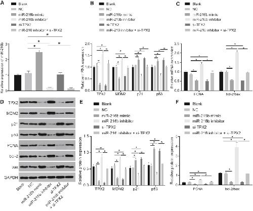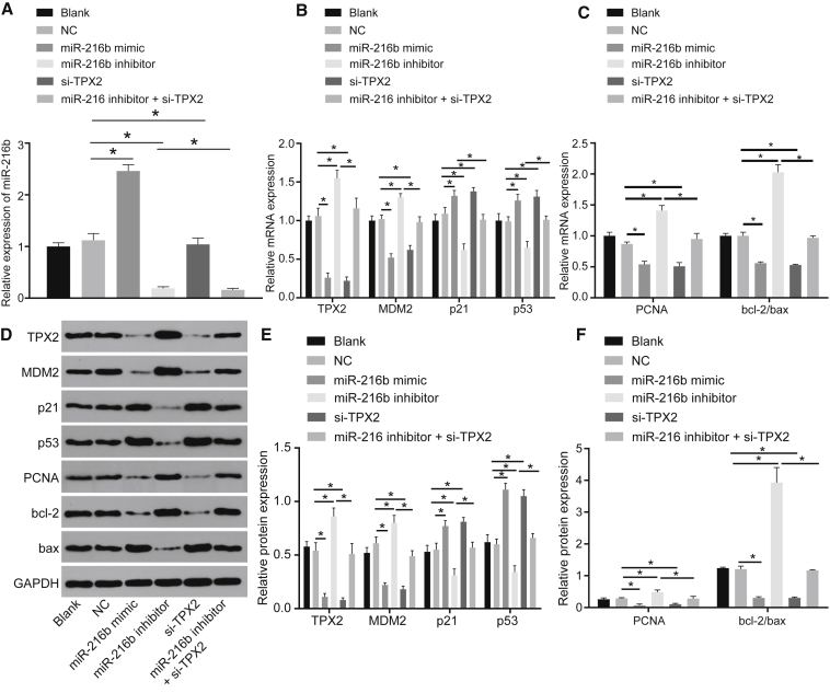 Figure 4. Overexpressed miR-216b Inhibits Proliferation and Induces Apoptosis through Activation of the p53 Signaling by Downregulating TPX2 in cSCC(A) miR-216b expression in A431 cells determined by qRT-PCR. (B) mRNA levels of p53, p21, TPX2, and MDM2 in A431 cells determined by qRT-PCR. (C) mRNA levels of proliferation marker PCNA and apoptosis-related factors bcl-2/bax in A431 cells determined by qRT-PCR. (D) Western blots of p53, p21, TPX2, MDM2, PCNA, and bcl-2/bax in A431 cells normalized to GAPDH. (E) Protein expressions of p53, p21, TPX2, MDM2 in A431 cells determined by western blot analysis. (F) Protein expressions of PCNA and bcl-2/bax in A431 cells determined by western blot analysis. Data were expressed as mean ± standard deviation, and data among multiple groups were compared by one-way ANOVA, followed by the Tukeyâs post hoc test. *p < 0.05.