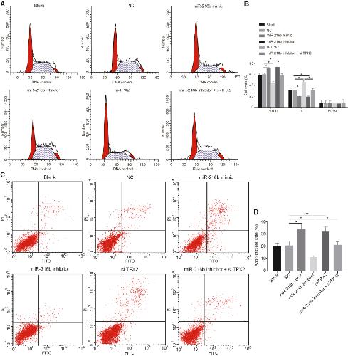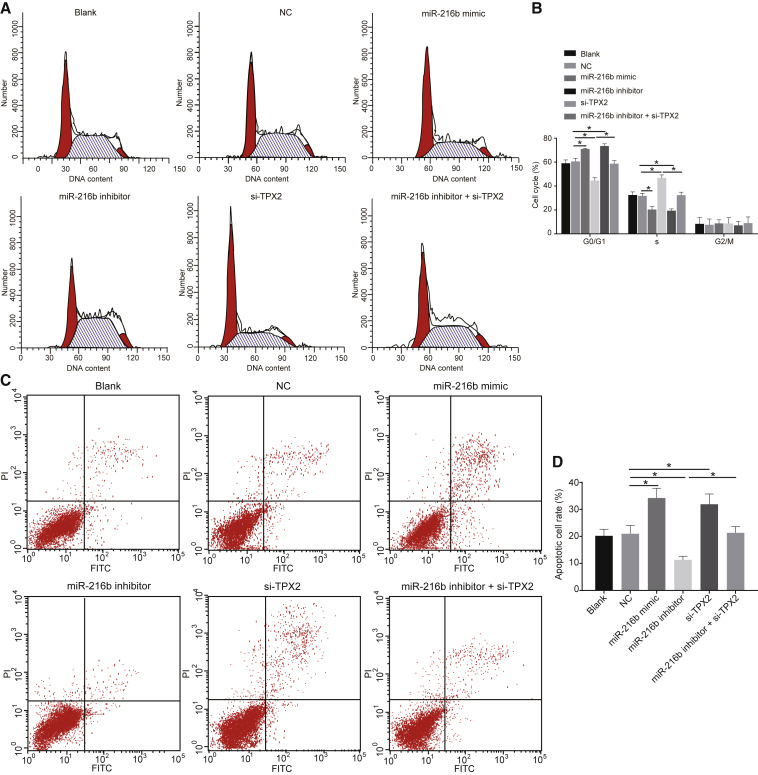 Figure 6. miR-216b Overexpression and TPX2 Silencing Block cSCC Cell-Cycle Entry and Promote Cell Apoptosis(A) Cell-cycle distribution assessed by flow cytometry. (B) Comparisons of G0/G1 and G2/M cells among each groups. (C) Apoptotic cell rate determined by flow cytometry. (D) Comparisons of apoptotic cell rate among each groups. Data were expressed as mean ± standard deviation and data among multiple groups were compared by one-way ANOVA, followed by the Tukeyâs post hoc test. *p < 0.05.