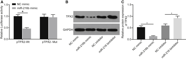 Figure 3. TPX2 Is Confirmed as a Target Gene of miR-216b(A) Luciferase activity of the TPX2-WT and TPX2-Mut after transfection determined by dual luciferase reporter gene assay. (B and C) Protein bands and protein levels of TPX2 in A431 cells normalized to GAPDH determined by western blot analysis. Data were expressed as mean ± standard deviation and analyzed by the unpaired t test. *p < 0.05.