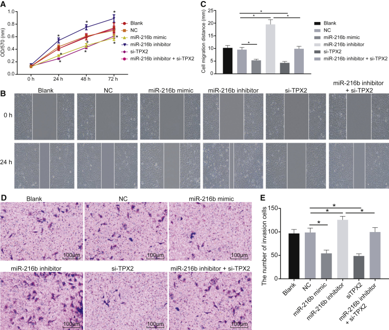 Figure 5. miR-216b Overexpression and TPX2 Silencing Reduce cSCC Cell Viability, Migration, and Invasion(A) Quantitative analysis for cell viability detected by MTT assay. (B) Microscopic views for cell migration detected by scratch test. (C) Quantitative analysis for cell migration detected by scratch test. (D) Microscopic views for cell invasion detected by Transwell assay (Ã100). (E) Quantitative analysis for cell invasion detected by Transwell assay. The data were expressed as mean ± standard deviation. Data comparisons among multiple groups were analyzed by one-way ANOVA, followed by the Tukeyâs post hoc test and data at different time points were compared using repeated-measures ANOVA. *p < 0.05.