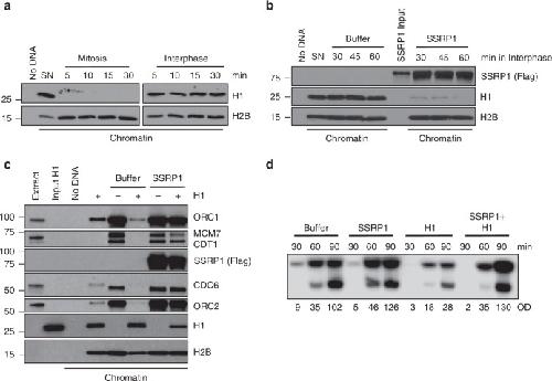 Fig. 3. SSRP1 counteracts histone H1-dependent inhibition of origin assembly.a Western blot (WB) of the indicated proteins bound to chromatin isolated from SN incubated with mitotic or interphase extracts for the indicated times. b WB of the indicated proteins bound to chromatin isolated from SN pre-incubated with 200âng/μl recombinant SSRP1 or control buffer and transferred to interphase extracts for the indicated times. SSRP1 input is 10% of the total. c WB of chromatin isolated from interphase egg extracts supplemented with sperm nuclei pre-incubated with buffer (â) or purified histone H1 (+) at a final concentration of 2âμM for 30âminâin the presence of 200âng/μl recombinant SSRP1 or control buffer and probed with the indicated antibodies. d Representative autoradiography of replication time course assay. Sperm nuclei were pre-incubated for 30âmin with 200âng/μl recombinant SSRP1, 2âμM histone H1, or both and then transferred to interphase extracts. Samples were taken at the indicated times after nuclei and α-32P-dCTP addition to egg extracts. OD for each lane is indicated. Images in all figures show a typical result of experiments repeated at least three times. |