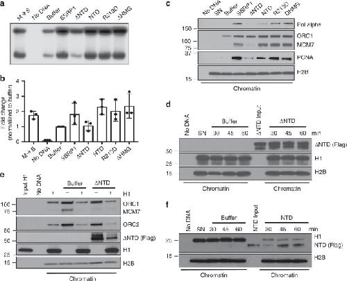 Fig. 5. SSRP1 N-Terminal domain dependent stimulation of DNA replication through histone H1 chromatin eviction.a Representative autoradiography of a DNA replication assay showing α-32P-dCTP incorporation for 120âmin in SN pre-incubated with 200âng/μl recombinant SSRP1 or equimolar amounts of its mutated versions, as indicated. b Graph indicating fold change in somatic DNA replication efficiency relative to buffer considered as 1. SN were pre-incubated with 200âng/μl recombinant SSRP1 or equimolar amounts of its mutated versions as indicated. Bars represent meanâ±âSEM. nâ=â3 independent experiments; pâ<â0.005 when comparing all values. Two-way anova. c WB of chromatin isolated at 60âmin after addition to interphase egg extracts of SN pre-incubated with 200âng/μl recombinant SSRP1 or equimolar amounts of its mutant versions and probed with the indicated antibodies. d WB of chromatin isolated at the indicate times from interphase egg extracts supplemented with SN pre-incubated with Flag-âNTD or control buffer. e WB of chromatin isolated from interphase egg extracts incubated for 60âmin with SN exposed to Flag-NTD or control buffer in the presence or absence of purified histone H1. f WB of chromatin isolated at the indicate times from interphase egg extracts incubated with somatic nuclei exposed to Flag-NTD or control buffer. |