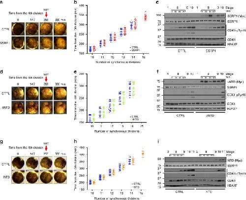 Fig. 6. SSRP1 induced delay of MBT onset.a Time lapse video frames taken from movie S1 at the indicated times from the 4th cleavage (set as time zero) of embryos injected at the one-cell stage. Top row: control buffer (CTRL) injected embryos; Bottom row: embryos injected with Myc-SSRP1 mRNA. Size barâ=â500âμm. b Graph showing the number of synchronous divisions-only of 24 embryos injected with Myc-SSRP1 mRNA or buffer and monitored up to 450âmin from fertilization. Only cleavages after the 10th are shown to simplify graph layout. Each dot represents one embryo. Bars show meanâ±âSEM. c WB using the indicated antibodies of whole embryos injected with Myc-SSRP1 mRNA or buffer and taken at the indicated stages. Stage 8 was sampled every 30âmin. d Images taken as in (a) from time-lapse movie S2. Embryos injected with control buffer or Myc-âNTD mRNA. Size barâ=â500âμm. e Graph showing the number of synchronous divisions monitored as in (b) of embryos injected with buffer or Myc-âNTD mRNA. f WB of whole embryos injected with Myc-âNTD mRNA or buffer and taken as in (c). g Images taken as in (a) from time-lapse movie S3 of embryos injected with control buffer or NTD mRNA. Size barâ=â500âμm. h Graph showing the number of synchronous divisions monitored as in (b) of embryos injected with control buffer or Myc-NTD mRNA. i WB of whole embryos injected with control buffer or Myc-NTD mRNA taken as in (c). |
