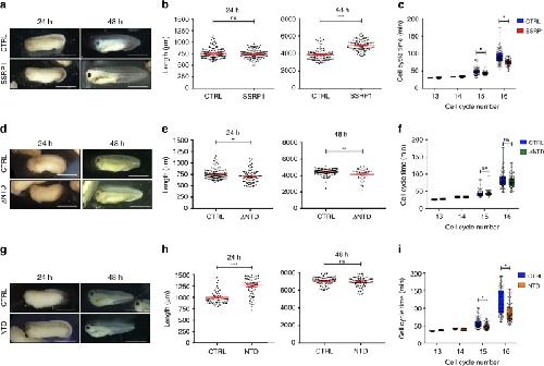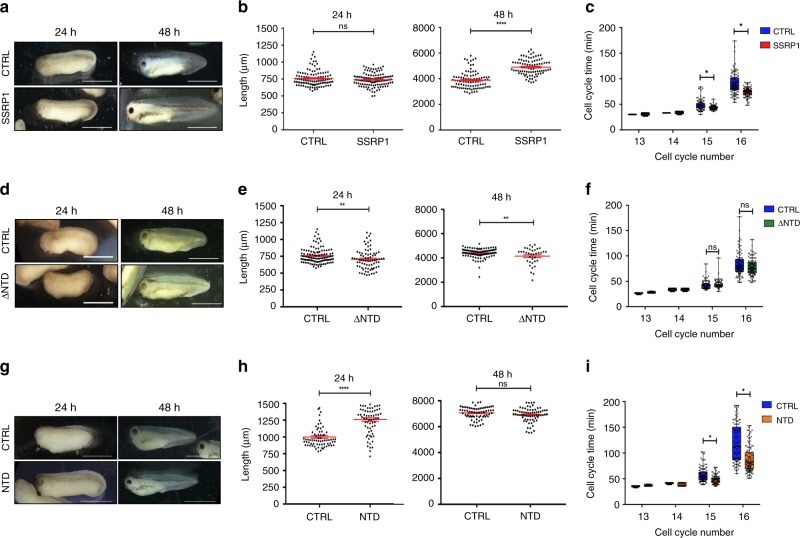 Fig. 7. SSRP1 induced development acceleration through cell cycle shortening.a Representative images of control buffer (CTRL) and Myc-SSRP1 (SSRP1) injected Xenopus laevis embryos at 24 and 48âhours pf. Size barâ=â1000âµm. b Graph showing lengths of CTRL and SSRP1- injected embryos measured 24 and 48âh pf. Each point represents one embryo. Bars show meanâ±âSEM; ****pâ<â0.0001; nsâ=ânot significant; nâ=â120 embryos; unpaired two-tailed t test. c Graph showing average length of cell cycle post-MBT per embryo measured for 30 cells starting at the 12th cell division using four embryos for each indicated condition. Cell cycle duration times between two sequential divisions were manually annotated from movies; nâ=â120 cell cycles; *pâ<â0.01; unpaired two-tailed t-test. d Representative images of CTRL and Myc-âNTDâinjected embryos at 24 and 48âh post-fertilization. Size barâ=â1000âµm. e Graph showing length of CTRL and Myc-âNTD mRNA injected embryos measured 24 and 48âh pf. Each point represents one animal. Bars show meanâ±âSEM; nâ=â100 embryos; **pâ<â0.01; unpaired two-tailed t test. f Graph showing average duration of cell cycle post-MBT measured as in (c); nâ=â120 cells; *pâ<â0.01; unpaired two-tailed t test. g Representative images of CTRL and NTD- injected embryos 24 and 48âh pf. All images are at identical scale. Size barâ=â1000âμm. h Graph showing length of CTRL and NTD mRNA injected embryos measured 24 and 48âh pf. Each point represents one embryo. Bars show meanâ±âSEM; nâ=â70 embryos; ****pâ<â0.0001; unpaired two-tailed t test. i Graph showing average duration of cell cycle post-MBT measured as in (c); nâ=â120 cell cycles; *pâ<â0.01; unpaired two-tailed t test. For graphs in (c), (f), (i), box height represents the 25th to 75th percentiles and the centerline represents the median. The whiskers extend to the farthest data point. |