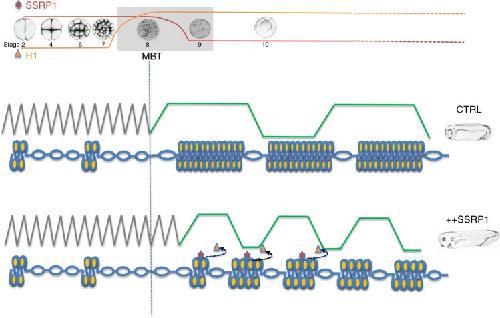 Fig. 8. Proposed model.In vitro SSRP1 suppresses histone H1 chromatin association and histone H1-mediated inhibition of DNA replication origins assembly. In vivo SSRP1 levels decrease around MBT when somatic forms of histone H1 start to be expressed. Overexpression of SSRP1 delays MBT onset. Persistent expression of SSRP1 in post-MBT embryos promotes faster somatic cell cycles and accelerated development. See text for more details. |