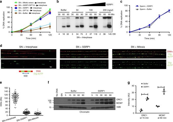 Fig. 2. SSRP1-dependent stimulation of replication origin assembly.a Graph showing replication time course of SN (4000 n/μl) replication. SN were pre-incubated for 30âmin with buffer, 200âng/μl recombinant SSRP1, SPT16 or both, as indicated, and transferred to interphase extracts (Interphase) or pre-incubated in CSF-arrested mitotic egg extract for 30âmin (Mitotic) then driven into interphase by CaCl2 addition. Each point represents the meanâ±âSEM. nâ=â3 independent experiments; pâ<â0.0001 when comparing mean values for all samples; Two-way anova. b Representative autoradiography of a DNA replication time course assay in interphase egg extract showing α-32P-dCTP incorporation in SN. Optical density (OD) for each lane is indicated. c Graph showing replication time course of sperm nuclei (8000 n/μl) treated as indicated. Each point represents meanâ±âSEM. nâ=â3 independent experiments; pâ=âns when comparing mean values for all samples; Two-way anova. d DNA fiber assay showing digoxigenin-dUTP (dig-dUTP) incorporation in SN incubated directly in interphase egg extract together with buffer (left), pre-incubated with 200âng/μl recombinant SSRP1 (center) or pre-incubated for 30âmin in CSF-arrested mitotic egg extract then driven into interphase by CaCl2 addition (right). DNA fibers are in red. Dig-dUTP labeled tracts are in green. Barâ=â10âKb. e Graphs showing IODs indicated in Kb for each sample. The center-to-center distances between adjacent Dig-dUTP tracks were measured and plotted analyzing 50 fibers pooled from three independent experiments; IODs and mean valuesâ±âSEM are shown; nâ=â100 individual IODs; pâ<â0.0001; Two-way anova. f Chromatin binding showing somatic nuclei incubated in interphase extract in the presence of buffer or recombinant SSRP1. Chromatin was isolated at the indicated times after addition to egg extract and blotted using the indicated antibodies. No DNA indicates absence of nuclei. SN indicates somatic nuclei alone. Image shows typical result. g Graph showing relative quantification of signal intensity of ORC1 and MCM7 proteins loaded on chromatin at the indicated times normalized to histone H2B. Bars represent mean intensityâ±âSEM. nâ=â3 independent experiments; pâ<â0.0005 when comparing mean values for ORC1 and MCM7; t-test. |