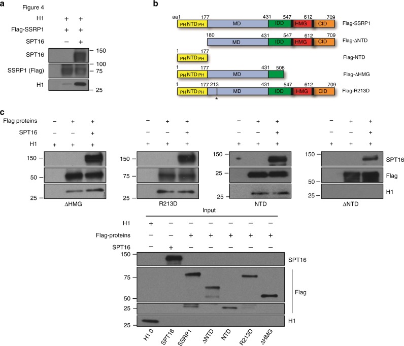 Fig. 4. SSRP1 interaction with histone H1 through its N terminal domain.a WB of Flag pull-down performed with recombinant human SPT16, Flag-SSRP1 and purified histone H1 using the indicated antibodies. b Schematic representation of Flag-SSRP1 mutated recombinant proteins used. Structural domains of wild-type SSRP1 protein are marked in color: N-terminal domain, NTD (Yellow); intrinsically disordered domain, IDD (green); C-terminal domain, CID (orange); Middle domain, MD (blue); HMG-box (red) and positively charged domains (black). Numbers indicate amino acid residues. PH indicates pleckstrin homology domain. *Indicates mutated residue. c) WB of in vitro pull-downs using the anti-Flag antibodies bound to agarose beads incubated with the indicated combinations of recombinant wild-type and mutant proteins. The mutated Flag-SSRP1 proteins used for the pull-downs are indicated under each panel. The inputs are shown in the panel below (Input). |