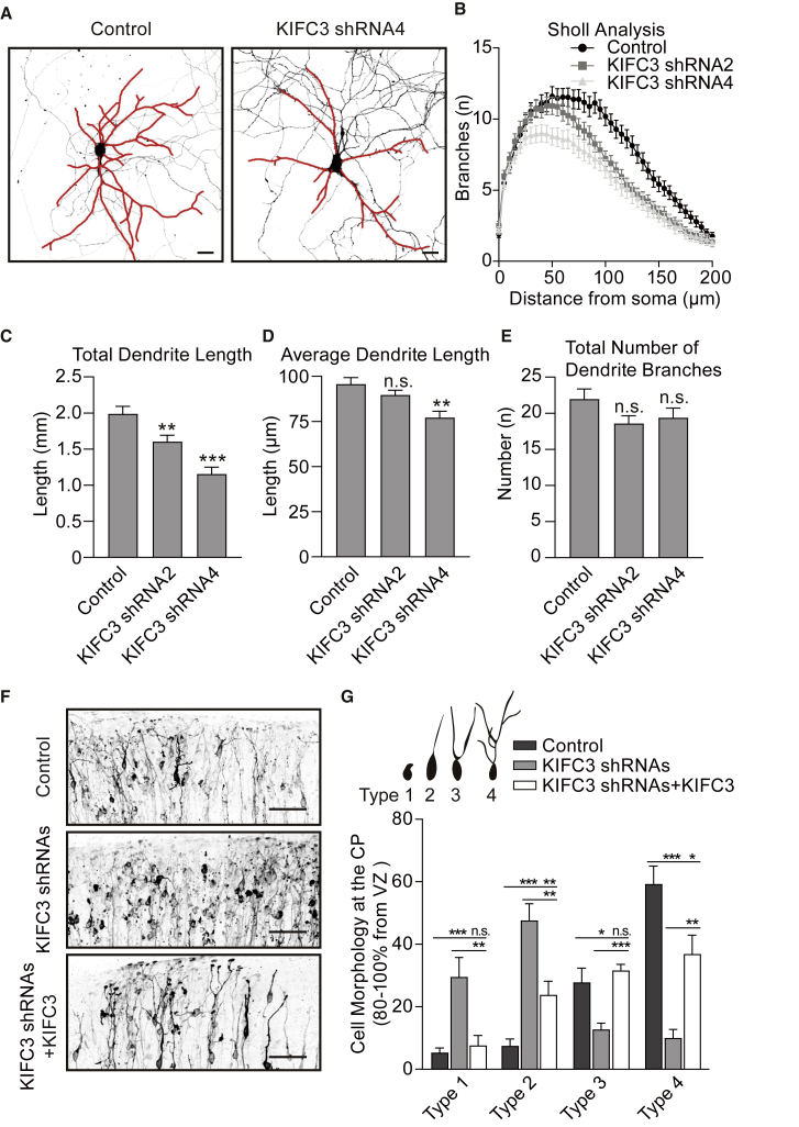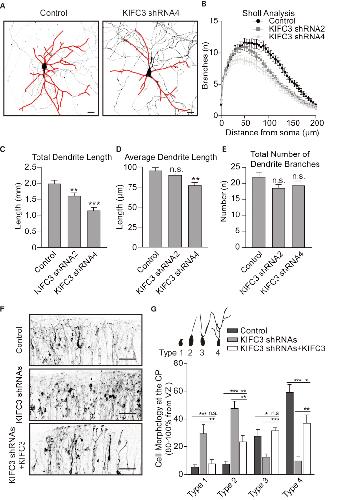 Figure 1. KIFC3 Is Important for Dendrite Branching(A and B) DIV11 hippocampal neurons expressing GFP and pSuper-scrambled shRNA as a control or KIFC3 shRNAs. shRNA efficiency was indicated in Figures S1A and S1B.(A) Representative images of the neurons with the dendrites marked in red. Scale bars, 25 μm.(B) Sholl analysis of the dendritic branching upon control and KIFC3 depletion. Control: N = 7, n = 46; KIFC3 shRNA2: N = 7, n = 57; KIFC3 shRNA4: N = 5, n = 36. Error bars represent SEM. Significant difference was shown in Figure S1C.(CâE) Quantification of the neurons described in (A) and (B). Total dendrite length (C), average dendrite length (D), and total number of dendrite branches (E) were quantified. Error bars, SEM. âp < 0.05; ââp < 0.01; âââp < 0.001 (unpaired t test).(F) Representative images of mouse cortical plate. Same images with larger view were used to quantify migration defects (Figures S1D and S1E). Neurons were transfected with MARCKS-GFP and KIFC3 shRNAs or pSuper-scrambled shRNA. A shRNAs-resistant mCherry-KIFC3 was used for rescue. Scale bars, 50 μm. Control: N = 10, n = 175; KIFC3 shRNAs: N = 8, n = 184; KIFC3 shRNAs+KIFC3: N = 9, n = 264.(G) Quantifications of the neuronal morphology of transfected cells in the cortical plate (CP), defined as 80%â100% of the radial axis from ventricular surface to the pial surface corresponding to (F). Error bars, SEM. âp < 0.05; ââp < 0.01; âââp < 0.001 (unpaired t test). Schematic diagram was used to show the typical morphology of different type neurons.