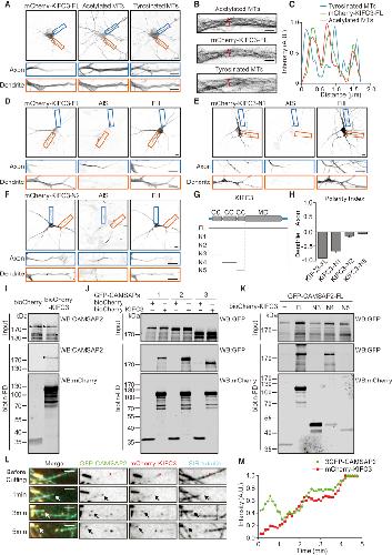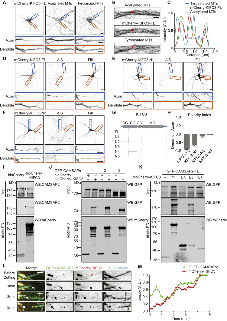 Figure 2. KIFC3 Localizes to Dendrites and Interacts with CAMSAP2(A and B) Representative images of DIV11 hippocampal neurons transfected with mCherry-KIFC3-FL and co-stained with acetylated tubulin and tyrosinated tubulin antibody.(A) Selected axonal (marked with a blue box) and dendritic (marked with an orange box) regions are enlarged below. Scale bars, 10 μm and 5 μm in enlargements.(B) Further enlargement of a dendrite region is shown. Scale bars, 2 μm.(C) Intensity profile of the indicated region in (B).(DâF) Representative images of DIV10 hippocampal neurons transfected with GFP fill and mCherry-KIFC3-FL (D), mCherry-KIFC3-N1 (E), or mCherry-KIFC3-N2 (F) and stained for TRIM46 to visualize the axon initial segment (AIS). Selected axonal (marked with a blue box) and dendritic (marked with an orange box) regions are enlarged below. Scale bars, 10 μm.(G) Schematic representation of the KIFC3 secondary structure and truncation constructs used. CC, coiled-coiled domain; MD, motor domain.(H) Polarity index analysis from KIFC3-FL and truncations corresponding to (D)â(F). Positive values indicate axon enrichment, and negative values indicate dendrite enrichment. Error bars, SEM. N = 2. KIFC3-FL: n = 12, KIFC3-N1: n = 10, KIFC3-N2: n = 9, and KIFC3-N5: n = 6.(I) Biotin pull-downs from extracts of HEK293T cells transfected with BirA recognition site conjugated mCherry-KIFC3-FL and probed for mCherry and CAMSAP2. For all pullâdown experiments, the input is 25% of the biotin pull-down. CAMSAP2 was found from KIFC3 pull-downs with brain extracts (Table S1). The interaction is also proved by co-localization experiment in neurons and COS7 cells (Figure S2; Video S1).(J) Biotin pull-downs from extracts of HEK293T cells transfected with BirA recognition site conjugated mCherry-KIFC3-FL together with GFP-tagged CAMSAP1, 2, or 3 and probed for mCherry and GFP.(K) Biotin pull-downs from extracts of HEK293T cells transfected with BirA recognition site conjugated KIFC3 truncation constructs together with GFP-tagged CAMSAP2 and probed for mCherry and GFP.(L) Representative images of COS7, transfected with 3GFP-CAMSAP2 and mCherry-KIFC3 (Video S2). Silicon rhodamine (SIR)-tubulin was applied to visualize microtubules. Microtubule photoablation was indicated by red stars. Minus end was indicated by white and black arrows. 3GFP-CAMSAP2 was shown in green, mCherry-KIFC3 in red, and SIR-tubulin in cyan. Scale bars, 2 μm.(M) The quantification of CAMSAP2 and KIFC3 puncta intensity corresponding to (L).