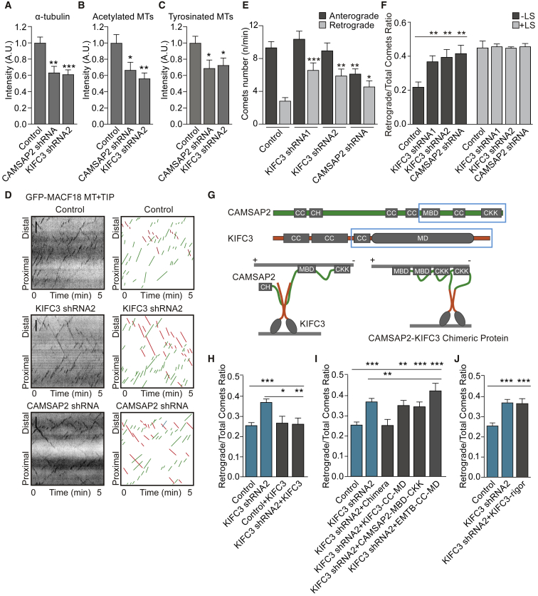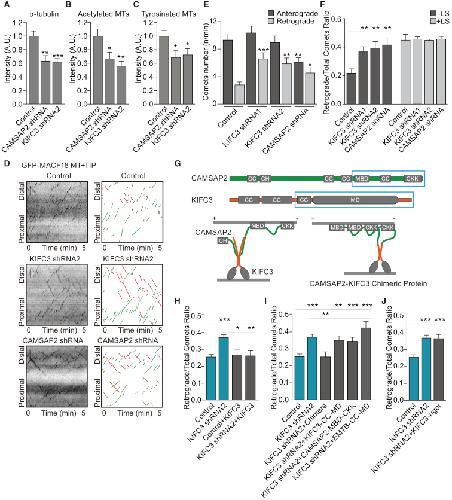 Figure 3. CAMSAP2 and KIFC3 Stabilize Minus-End-Out Microtubules(AâC) Quantification of α-tubulin (A), acetylated tubulin (B), and tyrosinated tubulin (C) levels in DIV11 neurons transfected with pSuper scrambled, CAMSAP2 shRNA, KIFC3 shRNA2, or KIFC3 overexpression (Figure S3A). (A) Control: N = 7, n = 58; CAMSAP2 shRNA: N = 7, n = 25; KIFC3 shRNA2: N = 7, n = 34. (B) Control: N = 3, n = 25; CAMSAP2 shRNA: N = 3, n = 12; KIFC3 shRNA2: N = 3, n = 15. (C) Control: N = 3, n = 25; CAMSAP2 shRNA: N = 3, n = 9; KIFC3 shRNA2: N = 3, n = 16. Error bars, SEM. Unpaired t test was performed, and columns were compared with corresponding control. âp < 0.05; ââp < 0.01; âââp < 0.001.(D) Original and illustrated kymographs of GFP-MACF18 traced with life-cell microscopy from control and KIFC3-shRNA2- and CAMSAP2-shRNA-transfected neurons. GFP-MACF18 was used to visualize microtubule plus-end tips. Anterograde comets are marked in green, and retrograde comets are marked in red. Scale bars, 3 μm.(E) Quantification of the number of comets moving retrogradely and anterogradely in dendrites of neurons described in (C). N = 2, control: n = 26, KIFC3 shRNA1: n = 20, KIFC3 shRNA2: n = 19, CAMSAP2 shRNA: n = 20. Error bars, SEM. âp < 0.05; ââp < 0.01; âââp < 0.001 (unpaired t test).(F) Quantification of the ratio of retrograde/total comets in dendrites of cells described in (D) with (black bars) and without (white bars) laser severing. No laser severing: N = 2, control: n = 26, KIFC3 shRNA1: n = 20, KIFC3 shRNA2: n = 19, CAMSAP2 shRNA: n = 20. Conditions with laser severing: control N = 1, n = 4; KIFC3 shRNA1 N = 1, n = 3; KIFC3 shRNA2 N = 1, n = 3; CAMSAP2 shRNA N = 2, n = 3. Error bars, SEM. âp < 0.05; ââp < 0.01; âââp < 0.001 (unpaired t test).(G) Schematic representation of the KIFC3, CAMSAP2, and CAMSAP2-KIFC3 chimeric protein. CH, calponin-homology domain; CKK, CKK domain; MBD, microtubule binding domain. The domains present in the chimeric protein are marked by blue rectangles. Green lines mark amino acids from CAMSAP2; orange lines mark amino acids from KIFC3. Microtubules with their orientations are marked in gray.(HâJ) Quantification of retrograde/total comets ratio in dendrites of neurons transfected with pSuper-scrambled as control or KIFC3 shRNA2 together with different KIFC3 rescue constructs. KIFC3-rigor was validated by peroxisome distribution assay (Figures S3B and S3C). Control: N = 12, n = 78; KIFC3 shRNA2: N = 13, n = 85; control+KIFC3-FL: N = 3, n = 13; KIFC3 shRNA2+KIFC3-FL: N = 3, n = 21; KIFC3 shRNA2+Chimera: N = 3, n = 18; KIFC3 shRNA2+KIFC3-CC-MD: N = 3, n = 22; KIFC3 shRNA2+CAMSAP2-MBD-CKK: N = 4, n = 37; KIFC3 shRNA2+EMTB-MBD-CKK: N = 3, n = 15; KIFC3 shRNA2+KIFC3-rigor: N = 4, n = 32. Error bars, SEM. Columns were compared with control or KIFC3 shRNA2, respectively. âp < 0.05; ââp < 0.01; âââp < 0.001 (unpaired t test).