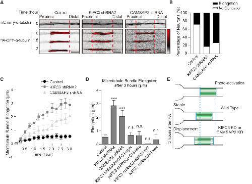 Figure 4. Dendritic Microtubules Become More Dynamic with KIFC3 or CAMSAP2 Depletion(A) Representative images of dendrites of hippocampal neurons DIV12 transfected with mCherry-α-tubulin, photoactivated GFP-α-tubulin together with pSuper-scrambled control, KIFC3 shRNA2, or CAMSAP2 shRNA (Video S3). Time is indicated at the left of each image. PA-GFP channel was indicated in black and red, and LUT was shown from the right. Red dash lines indicate the photoactivated microtubule region. Scale bars, 5 μm.(B) Quantification of the percentage of the neurons described in (A), in which the photoconverted region elongated.(C) Quantification of microtubule bundle elongation. Other measurements were shown in Figures S3DâS3J. Control: N = 5, n = 36; KIFC3 shRNA2: N = 4, n = 35; CAMSAP2 shRNA: N = 2, n = 15. Error bars, SEM.(D) Quantification of microtubule bundle elongation 3 h after photo-conversion corresponding to (A) and (C). KIFC3 shRNA2+KIFC3-rigor: N = 2, n = 20; KIFC3 shRNA2+KIFC3-Chimera: N = 3, n = 10; KIFC3 shRNA2+KIFC3-WT: N = 3, n = 12; KIFC3 shRNA2+Taxol: N = 3, n = 8. Error bars, SEM. Columns were compared with control. âp < 0.05; ââp < 0.01; âââp < 0.001 (unpaired t test).(E) Schematic graph of microtubule displacement in (A).
