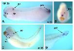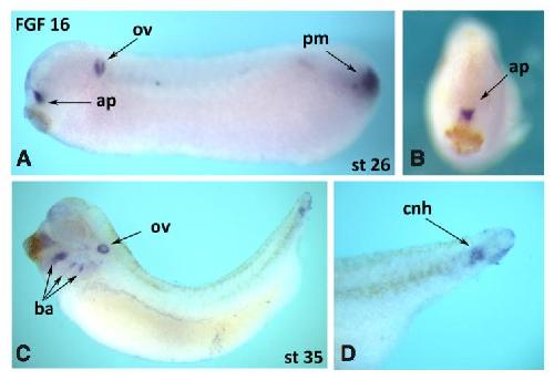 Fig. 3. Developmental expression pattern of FGF16 in X.laevis embryos. In situ hybridisation analysis was used to detect transcripts for FGF16 at several developmental stages in X. laevis embryos. At least 15 embryos were analysed at each stage (st). (A,B) St 26, lateral and anterior views respectively. (C,D) St 35, lateral and magni ed lateraltail views respectively. Abbreviations are as follows: anteriorpituitary (ap), otic vesicle (ov), plate mesoderm (pm), branchial arches (ba) and chordo- neural hinge (cnh).