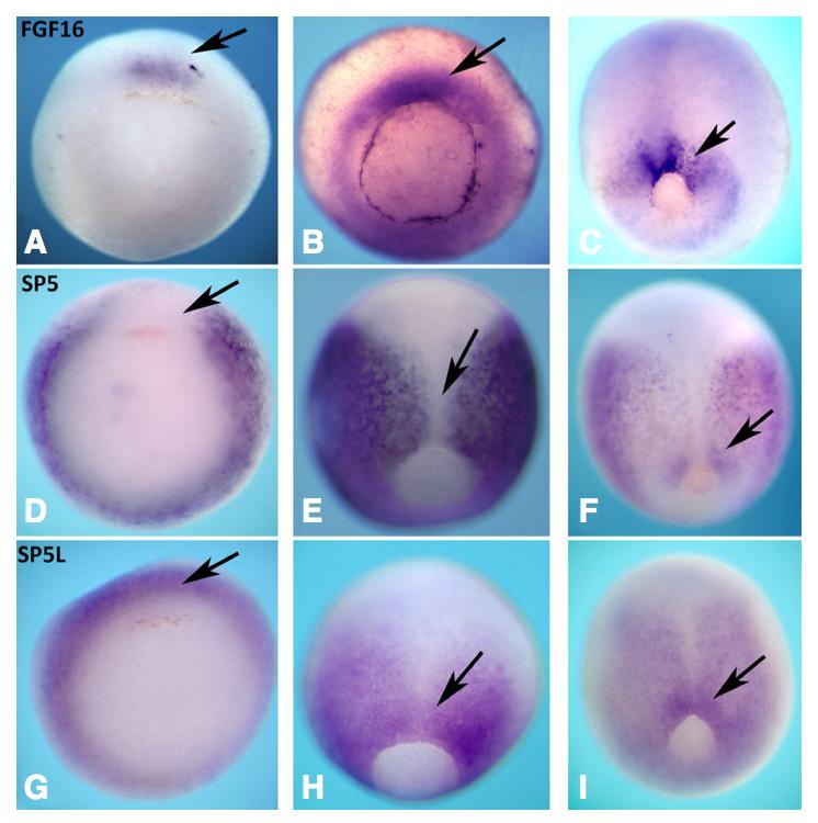 Fig. 2. Expression analysis FGF16, sp5 and sp5l in gastrula stage X.laevis em- bryos. In situ hybridisation analysis was used to detect transcripts for FGF16 (A-C), sp5 (D-F), and sp5l (G-I) during gastrulation. Stages 10 posterior/vegetal (A, D, G) 11 posterior/vegetal view (B, E, H) and 12 (C, F, I) posterior view. Arrow indicates dorsal blastopore lip in all panels.