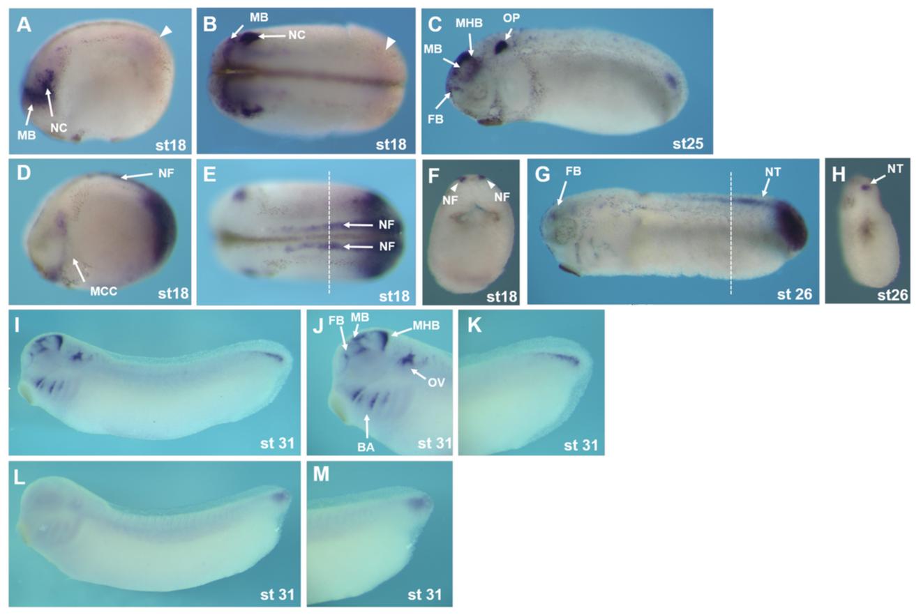 and dorsal views respectively. (F) Transverse section of the embryo in (E) at the level of the dashed line. (G) sp5l expression at tailbud st26, lateral view. (H) Transverse section of embryo in (G) at the level of the dashed line. (I-K) sp5 expression at tailbud st31, lateral view. (L,M) sp5l expression at tailbud st31, lateral view. Abbreviations: Midbrain (MB), Neural crest (NC), Forebrain (FB), Otic placode (OP), MidbrainHindbrain Boundary (MHB), Migrating crest cells (MCC) Neural fold (NF), Neural tube (NT), Branchial Arches (BA), Otic Vesicle (OV).