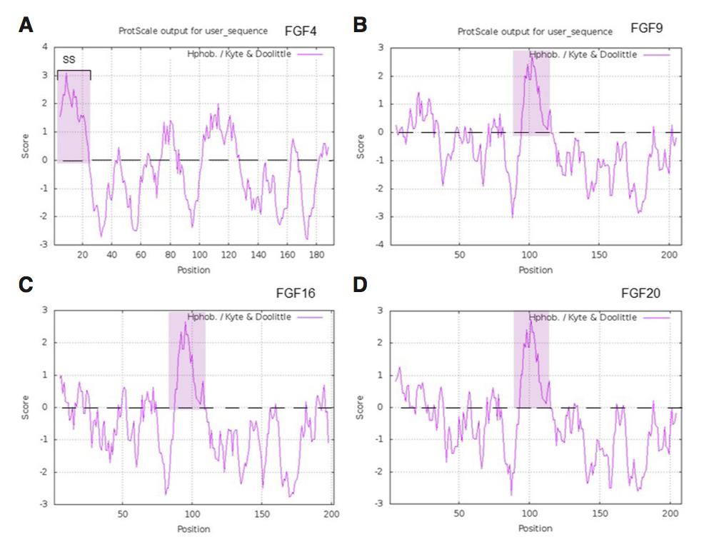 Fig. 5. Hydrophobicity plots for FGF9 family. Kyte and Doolittle hydrophobicity plots for (A) FGF4 and FGF9 sub-family members, (B) FGF9, (C) FGF16, and (D) FGF20. Scores above 0 (represented by the dotted line) indicate hydrophobic amino acids; sites of high hydro- phobicity are depicted as shaded areas. FGF4 has a âclassicâ signal sequence (SS) for co-translational secretion, but the members of the FGF9 subfamily have an internal hydrophobicity region which is as- sociated with secretion.