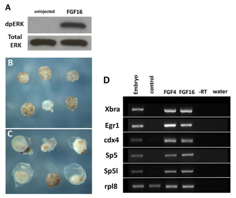 Fig. 6. FGF16 activates the MAPK pathway and activates sp5 and sp5l expression (A) Western blot to detect dpERK in uninjected control animal caps compared and animal caps injected with 50 pg of mRNA coding for FGF16 mRNA. Antibodies to diphospho-ERK (dp-ERK) and total ERK were incubated on the same blot sequentially after stripping. (B) Control animal caps after 3 days culture. (C) Animal caps expressing FGF16 from sibling embryos to those shown in (B). (D) RT-PCR on cDNA derived from whole embryos at stage 12 and on animal cap explants cultured to stage 12 that were either uninjected control explants or explants expressing FGF4 or FGF16. Expression of known FGF targets, xbra (27 cycles), egr1 (27 cycles) and cdx4 (27 cycles), as well as sp5 (25 cycles), sp5l and rpl8 loading control. Water, in which H2O replaced cDNA, and - RT, where no reverse transcriptase was used, functioned as negative controls.