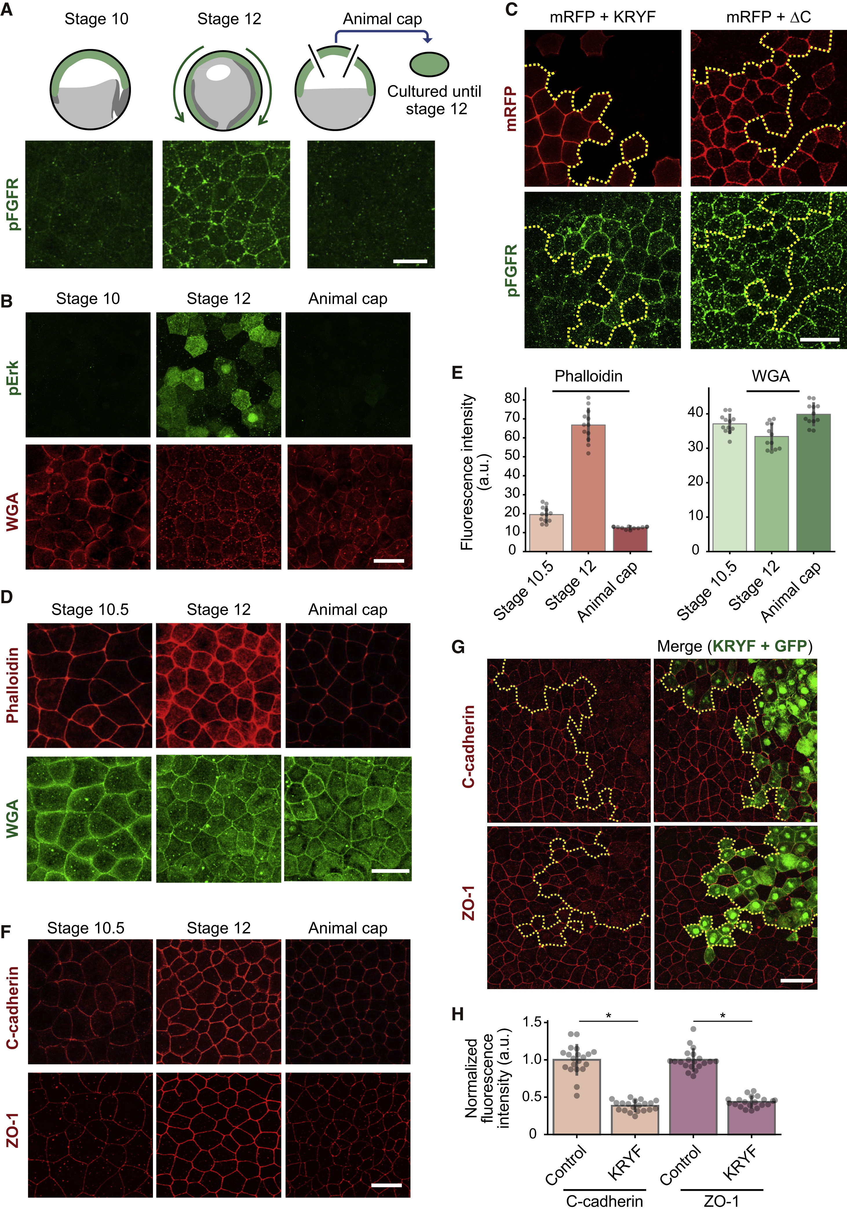 (D) mRNAs encoding FGFR-KRYF or Grb2-SH2 were co-injected with GFP mRNA at the four-cell stage. Embryos were centrifuged at 450 à g for 10 min and stained with indicated antibodies or phalloidin. Scale bar: 50 μm.