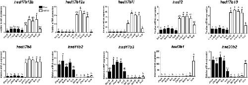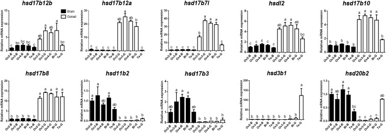FIGURE 5. Quantitative RT-PCR examination of 10 β-hsd genes expressions in the brain and gonad during sex reversal of grouper. Values represent the relative mRNA expression in relation to internal control (β-actin gene). Data were expressed as the mean ± SEM for four replicates. In each panel, different lowercase letters indicate significant differences (p < 0.05).