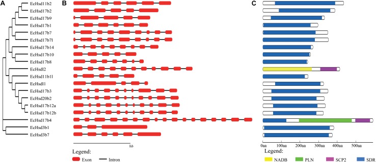FIGURE 2. Phylogenetic analysis, gene structure and conserved domains of β-hsd genes in orange-spotted grouper. (A) The phylogenetic tree of all β-Hsd in grouper was constructed using Neighbor-Joining method. (B) The exon/intron organization of β-hsd genes of grouper. The red boxes represent exons and black lines indicate introns. (C) The conserved protein domains in the β-Hsd were identified using CD-Search program. Each domain is indicated with a specific color. Yellow: NADB_Rossmann superfamily, green: PLN02864 superfamily, purple: SCP2 superfamily, blue: SDR superfamily.