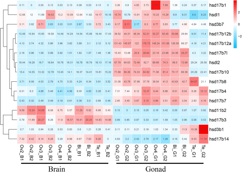 FIGURE 4. Clustering of the expression profiles of 19 grouper β-hsd genes during sex reversal. Genes were clustered according to phylogenetic relationships in expression profiles. The RPKM values were transformed into Z scores. Z scores were plotted according to Z = (x - μ)/σ, where x is the log 2 transformed gene expression measurement and μ and σ are the mean and standard deviations of expression of the gene. Red and blue colors indicate high and low relative expression levels after homogenization, respectively. The RPKM value for each gene and each stage was provided in the figure.