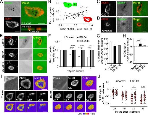 Figure 2. MMP-mediated ECM degradation regulates topological remodeling of aneural AChR clusters.(A) Representative confocal z-stack images showing the discrete and extensive degradation of fluorescent gelatin at the perforated regions within aneural AChR clusters. (B) Scatter plot analysis showing a positive correlation between the fluorescent gelatin intensity in perforated AChR clusters (a) divided by that in another region of the same cell (b) and the area of AChR-rich region (a) divided by that of the entire AChR clusters with perforations (a+p). R = 0.6458, p<0.0001. n = 84 from 3 independent experiments. (CâD) Representative images showing the degradation patterns of fluorescent gelatin (C) and laminin immunostaining (D) at AChR clusters in cultured C2C12 myotubes and Xenopus primary muscle cells, respectively. (E) Representative images showing the inhibitory effects of BB-94 or BB-2516 on fluorescent gelatin degradation. Dotted lines indicate the periphery of muscle cells. (F) Quantification on the extent of fluorescent gelatin degradation at the perforated regions of AChR clusters in control and BB-94/BB-2516-treated muscle cells over the first 4 consecutive days in culture. n > 280 muscle cells in each condition from 3 independent experiments. (G) Quantification on the effects of BB-94 or BB-2516 on the formation of bottom AChR clusters in cultured Xenopus muscle cells. n = 150 muscle cells in each condition from 3 independent experiments. (H) Quantification on the effects of BB-94 or BB-2516 on the stability of bottom AChR clusters in cultured Xenopus muscle cells. n = 166 (Control), 154 (BB-94), and 137 (BB-2516) muscle cells from 3 independent experiments. (I) Representative sets of time-lapse images showing the topological changes and fluorescence intensity of AChR clusters in control (left panels) and BB-94-treated (right panels) muscle cells. 8-bit pseudo-color images highlight the difference in AChR intensity at the same aneural clusters over 96 hr with or without BB-94 treatment. (J) An individual value plot showing the percentage change in the area of each aneural AChR clusters at different time-points between control and BB-94-treated cells. n = 43 (Control) and 38 (BB-94) muscle cells from 3 independent experiments. Data are represented as mean ± SD. Scale bars represent 5 μm. Data are represented as mean ± SEM, unless otherwise specified. Two-way ANOVA with Dunnettâs multiple comparisons test (F), one-way ANOVA with Dunnettâs multiple comparisons test (G and H), two-way ANOVA with Sidakâs multiple comparisons test (J), *, ***, **** represent pâ¤0.05, 0.001, and 0.0001 respectively. |