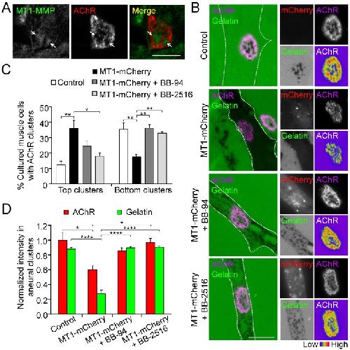 Figure 3. MT1-MMP activity precisely controls the extent of ECM degradation and AChR cluster formation.(A) Representative images showing the spatial localization of endogenous MT1-MMP in perforations of aneural AChR clusters (arrows) in fixed Xenopus muscle cultures. (B) Representative images showing the extent of fluorescent gelatin degradation in area covered by MT1-MMP-mCherry-overexpressing (MT1-mCherry) muscle cells in the presence or absence of MMP inhibitors BB-94 or BB-2516. 8-bit pseudo-color images highlight the relative fluorescence intensity of AChR clusters in different conditions. (C) Quantification on the effects of MT1-MMP-mCherry overexpression on the formation of AChR top and bottom clusters in response to BB-94 or BB-2516 treatment. n = 163 (Control), 123 (MT1-mCherry), 119 (MT1-mCherry + BB-94), and 62 (MT1-mCherry + BB-2516) muscle cells from 4 independent experiments. (D) Quantification on the effects of MT1-MMP-mCherry overexpression on the extent of fluorescent gelatin degradation and the intensity of aneural AChR clusters in response to BB-94 or BB-2516 treatment. For gelatin intensity measurement: n = 30 (Control), 39 (MT1-mCherry), 33 (MT1-mCherry + BB-94), and 31 (MT1-mCherry + BB-2516) muscle cells from 3 independent experiments. For AChR intensity measurement: n = 14 (Control), 19 (MT1-mCherry), 21 (MT1-mCherry + BB-94), and 16 (MT1-mCherry + BB-2516) muscle cells from 3 independent experiments. Scale bars represent 10 μm. Data are represented as mean ± SEM. One-way ANOVA with Dunnettâs multiple comparisons test (C), one-way ANOVA with Turkeyâs multiple comparisons test (D), *, **, **** represent pâ¤0.05, 0.01, and 0.0001 respectively. |
