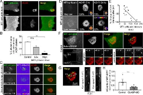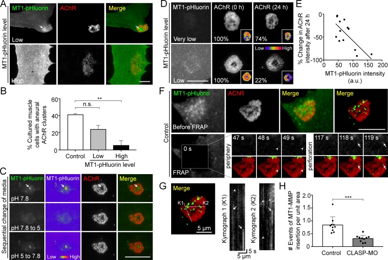 Figure 6. Spatial delivery of surface MT1-MMP regulates AChR cluster formation and remodeling.(A) Representative images showing the effects on aneural AChR clustering in cultured muscle cells over-expressing different levels of MT1-MMP-pHluorin (MT1-pHluorin). Arrows indicate the spatial localization of MT1-pHluroin at perforated regions of AChR clusters. (B) Quantification on the effects on aneural AChR cluster formation in cultured muscle cells with different levels of MT1-pHluorin over-expression. Cultured muscle cells with average MT1-pHluorin intensity above the cutoff value of >500 (arbitrary unit) were classified as high expression. n = 150 (Control), 32 (Low MT1-pHluorin level), and 15 (High MT1-pHluorin level) muscle cells from 3 independent experiments. (C) Representative sets of images showing the change in MT1-pHluorin fluorescence intensity in response to a sequential switching of various culture media with different pH levels. Arrows indicate the spatial localization of MT1-pHluroin signals in the perforated region of AChR clusters. 8-bit pseudo-color images highlight the change in the relative intensity of MT1-pHluorin. (D) Representative sets of time-lapse images showing the extent of AChR cluster remodeling in muscle cells with different MT1-pHluorin expression levels. 8-bit pseudo-color images in the insets highlight the change in the relative intensity of AChR clusters. The percentage values indicate the relative fluorescence intensity of AChR clusters after 24 hr. (E) A scatter plot analysis showing the correlation between MT1-pHluorin intensity and the percentage change in AChR intensity over 24 hr in cells with different MT1-pHluorin expression levels. The black line indicates a linear correlation. R = â0.7188, p=0.0056. n = 13 from 3 independent experiments. (F) Representative TIRF-FRAP images showing the surface insertion of MT1-pHluorin at AChR clusters in cultured muscle cells. Arrows and arrowheads indicate the spatial insertion of MT1-pHluorin at the perforation and periphery of AChR clusters, respectively. (G) Kymographs showing the spatiotemporal insertion of MT1-pHluorin at AChR clusters. Two kymographs were constructed from 180 time-lapse images along the lines of K1 and K2, as indicated in the merge image (left panel). Arrows indicate some newly inserted MT1-pHluorin that were relatively stable, while arrowheads indicate that some were dispersed shortly after surface insertion. (H) Quantification on the number of events of MT1-pHluorin surface insertion per unit area (μm2) of aneural AChR clusters over the entire time-lapse duration. n = 10 (Control) and 10 (CLASP-MO) muscle cells from 3 independent experiments. Scale bars represent 10 μm, unless otherwise specified. Data are represented as mean ± SEM. One-way ANOVA with Bonferroniâs multiple comparisons test (B), Studentâs t-test (H), **, *** represent pâ¤0.01 and 0.001 respectively. n.s.: non-significant. |