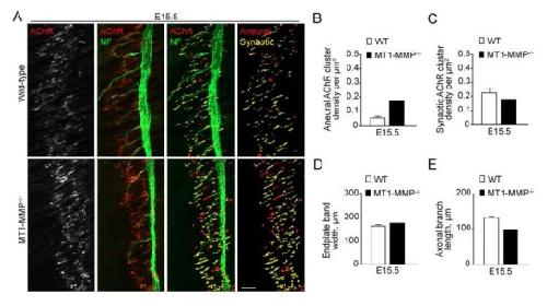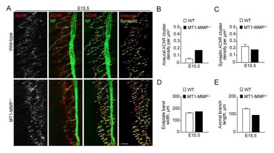 Author response image 3. Aneural versus synaptic AChR clusters in MT1-MMP-/- diaphragm muscles at E15.5.(A) Representative confocal images showing the AChR pre-patterns (red) and synaptic AChR clusters (yellow) in whole-mount diaphragms from control and MT1-MMP-/- mice at E15.5. Whole-mount tissues were stained for AChR and neurofilament (NF). (B-E) Quantification on the density of aneural (B) versus synaptic (C) AChR clusters, the width of end-plate bands (D), and the length of axonal branches (E) in diaphragm muscles between wild-type and MT1-MMP-/- mouse embryos. n = 3 (WT) and 1 (MT1-MMP-/-) embryos from 1 experiment only. Data are represented as mean ± SEM (WT). Scale bar represents 50 μm. |