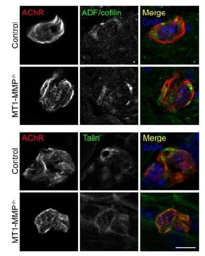 Author response image 4. Localization of PLS core and cortex markers at AChR clusters in postnatal mice.Representative confocal images showing the enrichment of PLS core marker, ADF/cofilin (top panels), and cortex marker, talin (bottom panels), at synaptic AChR clusters in longitudinal cryosections of hindlimb muscles isolated from P11 wild-type or MT1-MMP-/- mice. Maximum projection intensity images of 12 z-stack confocal frames with 0.48 µm intervals were constructed using ZEN 2.3 (Carl Zeiss). Scale bar represents 10 μm. |