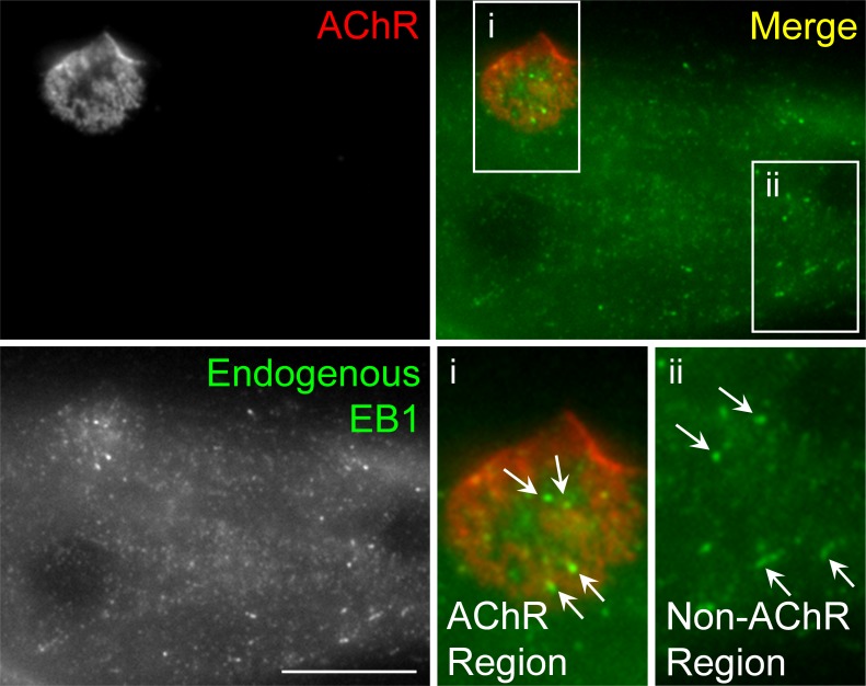 Figure 4—figure supplement 1. Immunostaining demonstrates the localization of endogenous EB1 in cultured Xenopus muscle cells.Representative images showing the localization patterns of endogenous EB1 proteins in fixed muscle cells. For clarity, two regions (AChR and non-AChR) were shown in the 2X magnified views. Similar to the localization of EB1-GFP, endogenous EB1 comets (arrows) were highly enriched in the perforated sites in AChR cluster region. Scale bar represents 10 μm. |