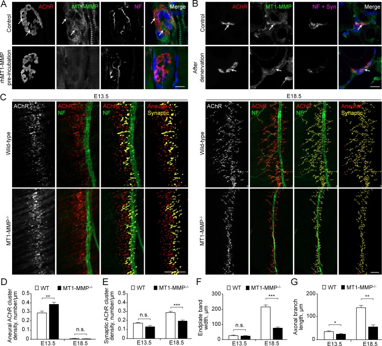 Figure 10. MT1-MMP is a regulator of NMJ development in vivo.(A) Representative confocal images showing the localization of endogenous MT1-MMP at perforations of synaptic AChR clusters (arrows, top panels) in longitudinal cryosections of adult rat soleus muscles. The specificity of MT1-MMP antibody was verified by pre-incubating anti-MT1-MMP primary antibody with recombinant human MT1-MMP protein (rhMT1-MMP, bottom panels). Neurofilament (NF) was used as a neuronal marker. (B) Representative confocal images showing the postsynaptic localization of MT1-MMP at NMJs as demonstrated by the surgical denervation experiment. Staining of AChR, MT1-MMP, and presynaptic marker (NF and synaptophysin (Syn)) was performed using cross sections from adult rat soleus muscles either without (top panels) or with sciatic nerve cut after 4 days (bottom panels). (C) Representative confocal images showing aneural versus synaptic AChR clusters in whole-mount diaphragms from wild-type (WT) control and MT1-MMP-/- mice at E13.5 (left panels) and E18.5 (right panels). Whole-mount tissues were stained for AChR and NF. The superimposed 3D reconstruction images were generated by z-stack images using Imaris. Synaptic AChR clusters (yellow) were identified when signals of AChR and NF overlapped with each other, whereas other AChR signals (red) represent aneural AChR clusters. (DâG) Quantification on the density of aneural (D) versus synaptic (E) AChR clusters, the width of end-plate bands (F), and the length of axonal branches (G) in diaphragm muscles between wild-type and MT1-MMP-/- mouse embryos at E13.5 and E18.5. n = 4 (E13.5, WT) and 5 (E13.5, MT1-MMP-/-), 5 (E18.5, WT), and 3 (E18.5, MT1-MMP-/-) embryos from three independent experiments. Scale bars represent 10 μm (A) or 100 μm (C). Data are represented as mean ± SEM. Two-way ANOVA with Sidakâs multiple comparison test (D and E), Studentâs t-test (F and G), *, **, *** represent pâ¤0.05, 0.01, and 0.001 respectively. n.s.: non-significant. |