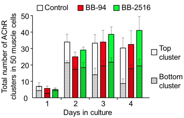 Author response image 1. Quantitative analysis on the total AChR clusters in cultured cells treated with MMP inhibitors.By monitoring muscle cells over 4 days in culture, AChR clusters located in the top versus bottom surface of the muscle cells were quantified in different experimental groups. Data are represented as mean ± SEM. n = 150 muscle cells in each experimental group from 3 independent experiments. |