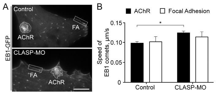 Author response image 2. Cortical microtubule capturing at AChR and focal adhesion regions.(A) Representative TIRF images showing the hotspots of EB1-GFP comets in AChR clusters and focal adhesion (FA) structures in control or CLASP-MO muscle cells. (B) Quantitative analyses showing the speed of EB1-GFP comets in AChR cluster and focal adhesion regions between control and CLASP-MO muscle cells. n = 15 (Control) and 13 (CLASP-MO) cells from 4 independent experiments. Scale bar represents 10 μm. Data are represented as mean ± SEM. Studentâs t-test, * represents p ⤠0.05. |