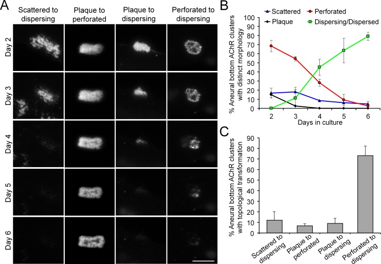 Figure 1—figure supplement 1. Most aneural AChR clusters are gradually dispersed in cultured Xenopus muscle cells over time.(A) Representative images showing the gradual topological changes of aneural AChR clusters observed in cultured Xenopus muscle cells from day 2 to 6 in culture. (B) Quantification on the percentage of aneural AChR clusters with different topological features over 6 days in culture. Aneural AChR clusters were first located on day 2, and the same clusters were followed for 4 consecutive days to observe their topological changes. n = 73 muscle cells from 3 independent experiments. (C) Quantification on different types of topological transformation of aneural AChR clusters observed in the same group of muscle cells in B. Scale bar represents 10 μm. Data are represented as mean ± SEM. |