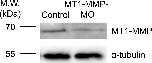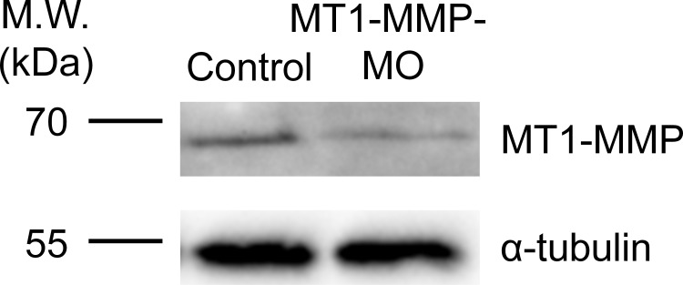 Figure 8—figure supplement 1. Endogenous MT1-MMP protein level is effectively reduced by specific antisense morpholino oligonucleotides.Western blot analysis showing the reduced endogenous MT1-MMP protein level in Xenopus embryos injected with MT1-MMP-MO. α-tubulin was used as a loading control. |