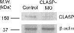 Figure 4—figure supplement 2. Endogenous CLASP protein level is effectively reduced by specific antisense morpholino oligonucleotides.Western blot analysis showing the reduced endogenous CLASP protein level in Xenopus embryos injected with CLASP-MO. β-actin was used as a loading control. |