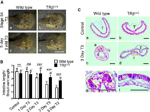 Fig. 3. Homozygous TRβ mutant tadpoles have drastically reduced responses to exogenous T3. A Representative photos of tadpoles treated with 5 nM T3 for 5 days. Age-matched stage 54 tadpoles were randomly selected and kept in a 4L plastic container with (c and d) or without (a and b) 5 nM T3 treatment for 5 days. They were then genotyped and photographed dorsally. Note that after T3 treatment, the wild type tadpole (c) showed obviously metamorphic changes and was morphologically distinct from TRβ(â/â) tadpoles (d), which was similar to the untreated tadpoles. Bars: 1 mm. BTRβ knockout tadpoles had reduced intestinal shortening in response to T3. The lengths of the intestine of the tadpoles as treated in A were measured and normalized against the snout-vent length. Note that after T3 treatment, the intestine was significantly shortened in wild type tadpoles but this change was reduced and delayed in the TRβ(â/â) tadpoles. Different lower-case letters denote statistically significant differences (Pâ<â0.05) when compared in each genotypes and asterisks (** or ***) indicate a significant difference when compared to the wild type group at the indicated days for T3 treatment (Pâ<â0.01 or Pâ<â0.001). ns: no significant difference. C T3 treatment failed to induce epithelial remodeling in the TRβ knockout tadpoles. Age-matched tadpoles at stage 54 were treated with 5 nM T3 for 3 days. Cross-sections of the intestine isolated from wild type (a, c and e) and TRβ knockout (b, d and f) tadpoles were stained with MGPY (methyl green-pyronin Y). Dashed red boxes (c and d) indicate the higher magnification (e and f), respectively. The black-dotted lines depict the epithelium-mesenchyme boundary, drawn based on morphological differences between epithelial cells and mesenchyme cells in the pictures of the stained tissues. The yellow-dotted lines indicate the cluster of proliferating epithelial cell which are well stained in wild type tadpoles after 3 days T3 treatment (e). T typhlosole. Bars: 100 µm |