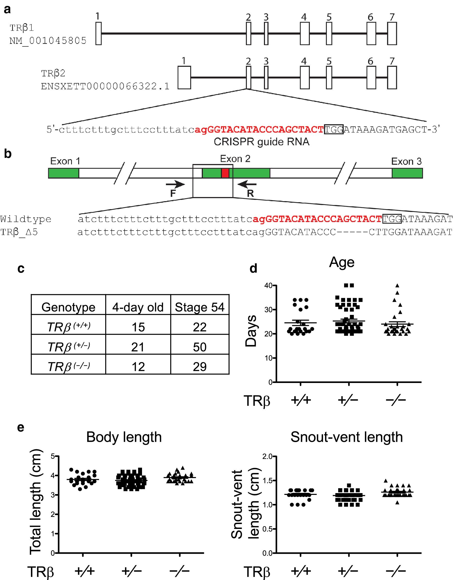 Fig. 1. Knocking out TRβ gene in Xenopus tropicalis does not affect early development. a Genomic structure of X. tropicalis TRβ gene and the CRISPR-short guide RNA (sgRNA) targeting TRβ. There are two known transcripts for X. tropicalis TRβ, each with 7 exons (boxes). The TRβ specific sgRNA was designed to target exon 2 present in both transcripts. The sgRNA sequences are shown in red. b Schematic diagram depicting the sequence of the sgRNA targeted region in the wild type and a TRβ mutant (5 base out-of-frame deletion) animal. Arrows represent primers used for genotyping: the forward primer F and the reverse primer R, respectively. c Mendelian distribution of 4-day old (around stage 45/46) or stage 54 tadpoles obtained from mating two TRβ(+/â) animals. Genotyping PCR was carried out by using tail tip genomic DNA of randomly selected 4-day old (stage 45/46) and stage 54 tadpoles, the onset of metamorphosis, and the results were close to the expected Mendelian distribution for the three expected genotypes. d Knocking out TRβ does not affect the developmental rate up to the onset of metamorphosis (stage 54). The time in days for each animal obtained from mating two TRβ(+/â) frogs to reach stage 54 was recorded and presented with the mean, marked as a line, and standard error (SE). No significant difference was observed for the 3 genotypes. e Knocking out TRβ does not affect the animal size and morphology at stage 54. The total body length and snout-vent length were measured on randomly selected animals at stage 54 and presented with the mean, marked as a line, and standard error (SE). No significant difference was observed for the 3 genotypes |