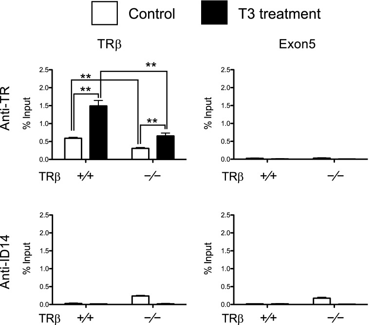 Fig. 5. TRβ knockout reduces TR binding to the TRE region in the tadpole intestine after T3 treatment. Five or more age-matched wild type and TRβ knockout tadpoles at stage 54 were kept in 4-l plastic container and treated with or without 10 nM T3 for 18 h. The chromatin of the intestine was isolated and immunoprecipitated with antibodies against TR and ID14 as a negative control. The immunoprecipitated DNA was analyzed by real-time PCR for the presence of the TRE region or the exon 5, which lacks any TRE, of the TRβ gene. Note that TR binding to the TRE region was significantly reduced in the intestine of TRβ knockout tadpoles. Two asterisks (**) indicate statistically significant differences (Pâ<â0.01) |