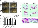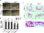 Figure 3. Homozygous TRβ mutant tadpoles have drastically reduced responses to exogenous T3. A Representative photos of tadpoles treated with 5 nM T3 for 5 days. Age-matched stage 54 tadpoles were randomly selected and kept in a 4L plastic container with (c and d) or without (a and b) 5 nM T3 treatment for 5 days. They were then genotyped and photographed dorsally. Note that after T3 treatment, the wild type tadpole (c) showed obviously metamorphic changes and was morphologically distinct from TRβ(â/â) tadpoles (d), which was similar to the untreated tadpoles. Bars: 1 mm. BTRβ knockout tadpoles had reduced intestinal shortening in response to T3. The lengths of the intestine of the tadpoles as treated in A were measured and normalized against the snout-vent length. Note that after T3 treatment, the intestine was significantly shortened in wild type tadpoles but this change was reduced and delayed in the TRβ(â/â) tadpoles. Different lower-case letters denote statistically significant differences (Pâ<â0.05) when compared in each genotypes and asterisks (** or ***) indicate a significant difference when compared to the wild type group at the indicated days for T3 treatment (Pâ<â0.01 or Pâ<â0.001). ns: no significant difference. C T3 treatment failed to induce epithelial remodeling in the TRβ knockout tadpoles. Age-matched tadpoles at stage 54 were treated with 5 nM T3 for 3 days. Cross-sections of the intestine isolated from wild type (a, c and e) and TRβ knockout (b, d and f) tadpoles were stained with MGPY (methyl green-pyronin Y). Dashed red boxes (c and d) indicate the higher magnification (e and f), respectively. The black-dotted lines depict the epithelium-mesenchyme boundary, drawn based on morphological differences between epithelial cells and mesenchyme cells in the pictures of the stained tissues. The yellow-dotted lines indicate the cluster of proliferating epithelial cell which are well stained in wild type tadpoles after 3 days T3 treatment (e). T typhlosole. Bars: 100 µm |