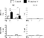 Figure 5. TRβ knockout reduces TR binding to the TRE region in the tadpole intestine after T3 treatment. Five or more age-matched wild type and TRβ knockout tadpoles at stage 54 were kept in 4-l plastic container and treated with or without 10 nM T3 for 18 h. The chromatin of the intestine was isolated and immunoprecipitated with antibodies against TR and ID14 as a negative control. The immunoprecipitated DNA was analyzed by real-time PCR for the presence of the TRE region or the exon 5, which lacks any TRE, of the TRβ gene. Note that TR binding to the TRE region was significantly reduced in the intestine of TRβ knockout tadpoles. Two asterisks (**) indicate statistically significant differences (Pâ<â0.01) |