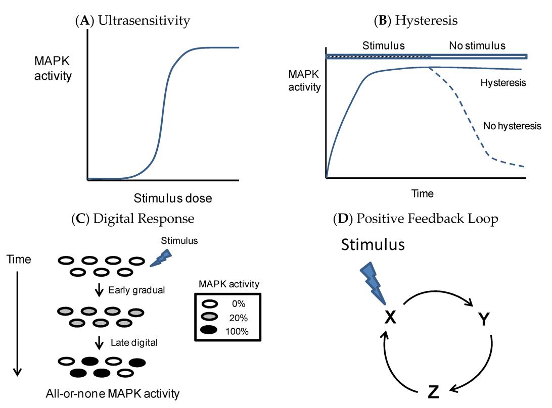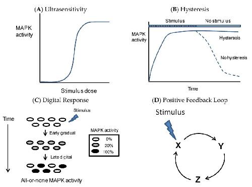 Figure 2. Basic properties of MAPK (mitogen-activated protein kinase) signaling pathways. (A) Ultrasensitivity: A small increase in the stimulus produces a very large response in MAPK activity. Graphically, this is illustrated with a sigmoid curve, implying a threshold level for MAPK activation. Several biochemical mechanisms can explain this behavior. (B) Hysteresis: MAPKs in front of a certain stimulus, and under certain conditions, present sustained activation even when the stimulus has disappeared but under different conditions or stimulus, could return to basal levels (no hysteresis). (C) Digital response: single cells exposed to a certain dose of stimulus will present an initial homogeneous activation of MAPK (20% activity, graded response), which could be converted into an all-or-none response (0% or 100% activity, digital response) at a later time. The generation of digital responses in stress sensors depends on time, threshold levels of activation, ultrasensitivity, and the presence of positive feedback loops. (D) Positive feedback-loop: An initial stimulus will activate X, which in turn will activate Y, which will feed back to the input X. These loops, that once engaged would be independent of the initial stimulus, are commonplace in irreversible biological processes. |