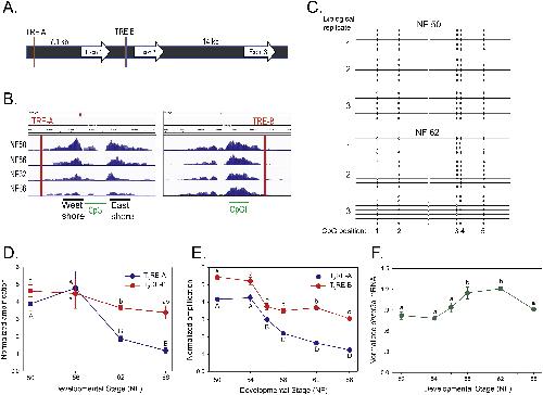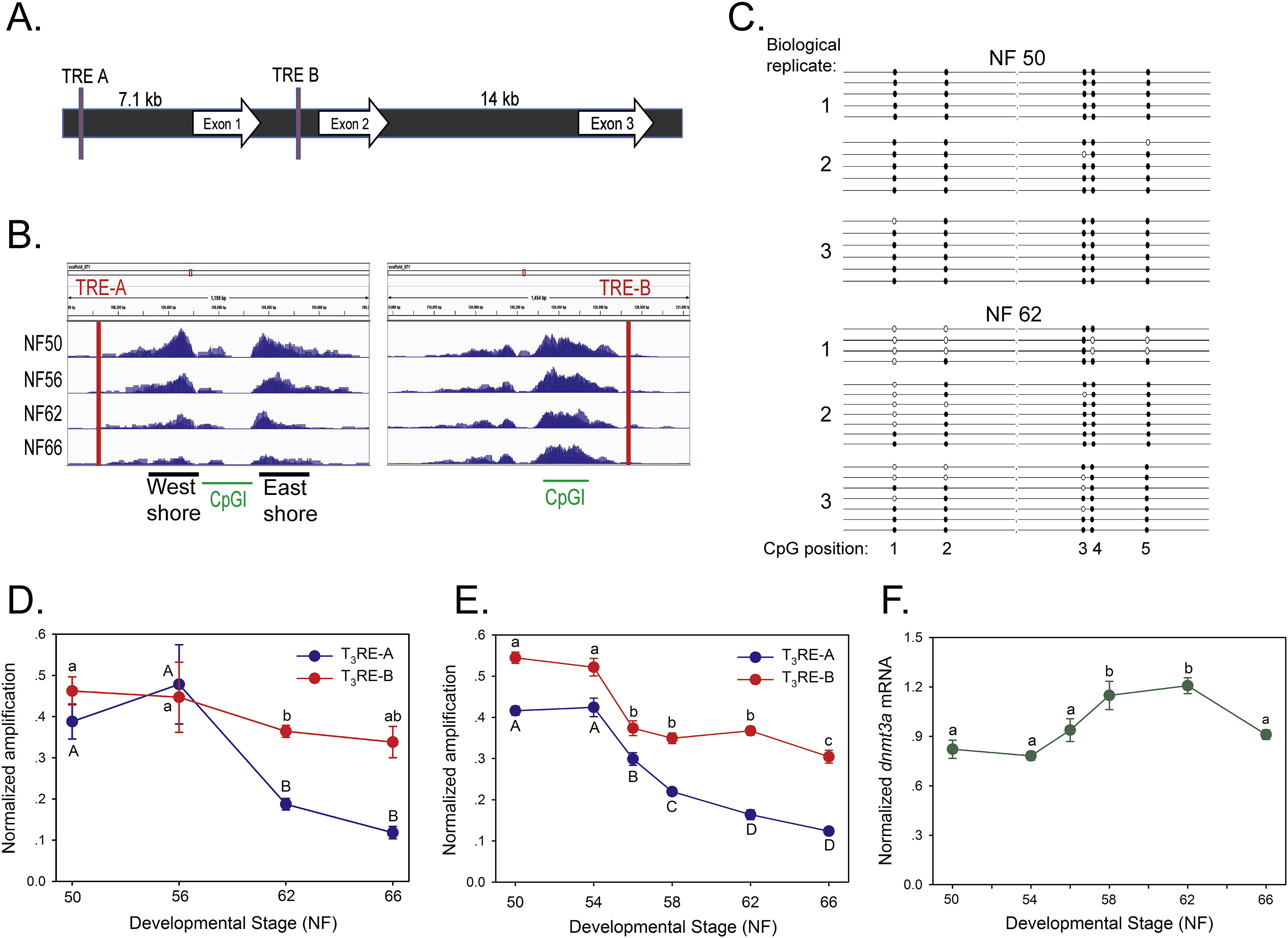 Fig. 4. DNA demethylation during metamorphosis at the dnmt3a locus correlates with increased dnmt3a mRNA. We isolated genomic DNA from X. tropicalis tadpole brain (preoptic area/thalamus/hypothalamus) at different stages of metamorphosis and analyzed DNA methylation using several approaches. A. Schematic depiction of the X. tropicalis dnmt3a locus. The locations of the two TREs that we identified previously are shown as red bars (Kyono et al., 2016a). B. IGV genome browser tracks for MethylCap-seq reads at the X. tropicalis dnmt3a locus at four stages of metamorphosis (NF â Nieuwkoop-Faber). CpGI â CpG island, with the CpG island âshoresâ indicated. The locations of genomic fragments of the dnmt3a gene that we amplified by PCR for each of the analyses described below are given in Supplemental Fig. 13. C. Lollipop diagram depicting results from bisulfite sequencing of the region of the âwest shoreâ proximal to the dnmt3a TRE-A. We extracted DNA from tadpole brain at NF stages 50 and 62 (pre-metamorphosis and metamorphic climax), conducted bisulfite sequencing, and subcloned PCR-amplified DNA into the pGEM-Teasy vector for direct DNA sequencing. We sequenced 4â7 clones for each biological replicate (n â= â3/developmental stage). Closed circles show methylated cytosines, open circles unmethylated cytosines. D. We conducted MethylCap assay that targeted the regions of the dnmt3a gene proximal to the two TREs that we identified previously (primer sequences in Supplemental Table 4). Points represent the mean â± âSEM (n â= â4/developmental stage) of the normalized PCR amplification signal (normalized to the input). Means with the same letter are not significantly different (p â< â0.001, ANOVA; lower case TRE-A, upper case TRE-B). E. We conducted methylation-sensitive restriction digest/qPCR (chop-qPCR) assays that targeted the regions of the dnmt3a gene proximal to the two TREs that we identified previously (primer sequences in Supplemental Table 4). Points represent the mean â± âSEM (n â= â5/developmental stage) of the normalized PCR amplification signal (normalized to the quantity of the amplicons from neighboring genomic regions that did not contain restriction sites). Means with the same letter are not significantly different (p â< â0.0001, ANOVA; lower case TRE-A, upper case TRE-B). F. We measured dnmt3a mRNA by RTqPCR in the region of the preoptic area/thalamus/hypothalamus of X. tropicalis tadpole brain during metamorphosis. The dnmt3a mRNA was normalized to the reference gene alpha-actinin mRNA which did not change during development (data not shown). Points represent the means â± âSEM (n â= â5/developmental stage), and means with the same letter are not significantly different (p â< â0.001; ANOVA). |
