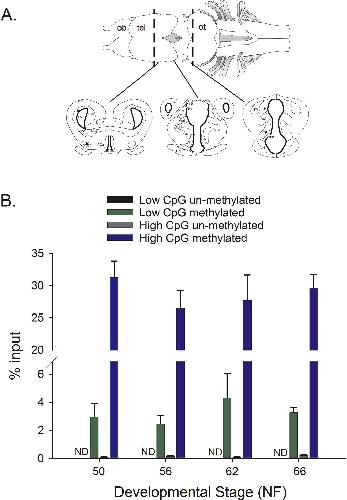 Supplemental Fig. 1. A. Region of the Xenopus brain dissected for RNA and genomic DNA extraction for RNA-seq and MethylCap-seq analyses, respectively. The anatomical diagrams are from Tuinhof et al. [1]; see Supplemental Fig. 17 and Supplemental Table 5 for complete neuroanatomy of Xenopus brain. B. The capture efficiency of methylated DNA was similar among samples. We measured the abundance of the spike-in control DNAs (generated by PCR amplification of different regions of lambda phage DNA that differed in their CpG content) in the high-salt fraction of the MethylCap procedure using real-time qPCR. The DNA fragments were purified, then subjected to in vitro methylation (or not) as described in the Materials and Methods. Low CpG un-methylated: lambda DNA fragment with a low density of CpG dinucleotides subjected to mock in vitro methylation; Low CpG methylated: lambda DNA fragment with a low density of CpG dinucleotides subjected to in vitro methylation; High CpG un-methylated: lambda DNA fragment with a high density of CpGs subjected to mock in vitro methylation; High CpG methylated: lambda DNA fragment with a high density of CpGs subjected to in vitro methylation. Bars represent the mean±SEM (n=4/developmental stage). |