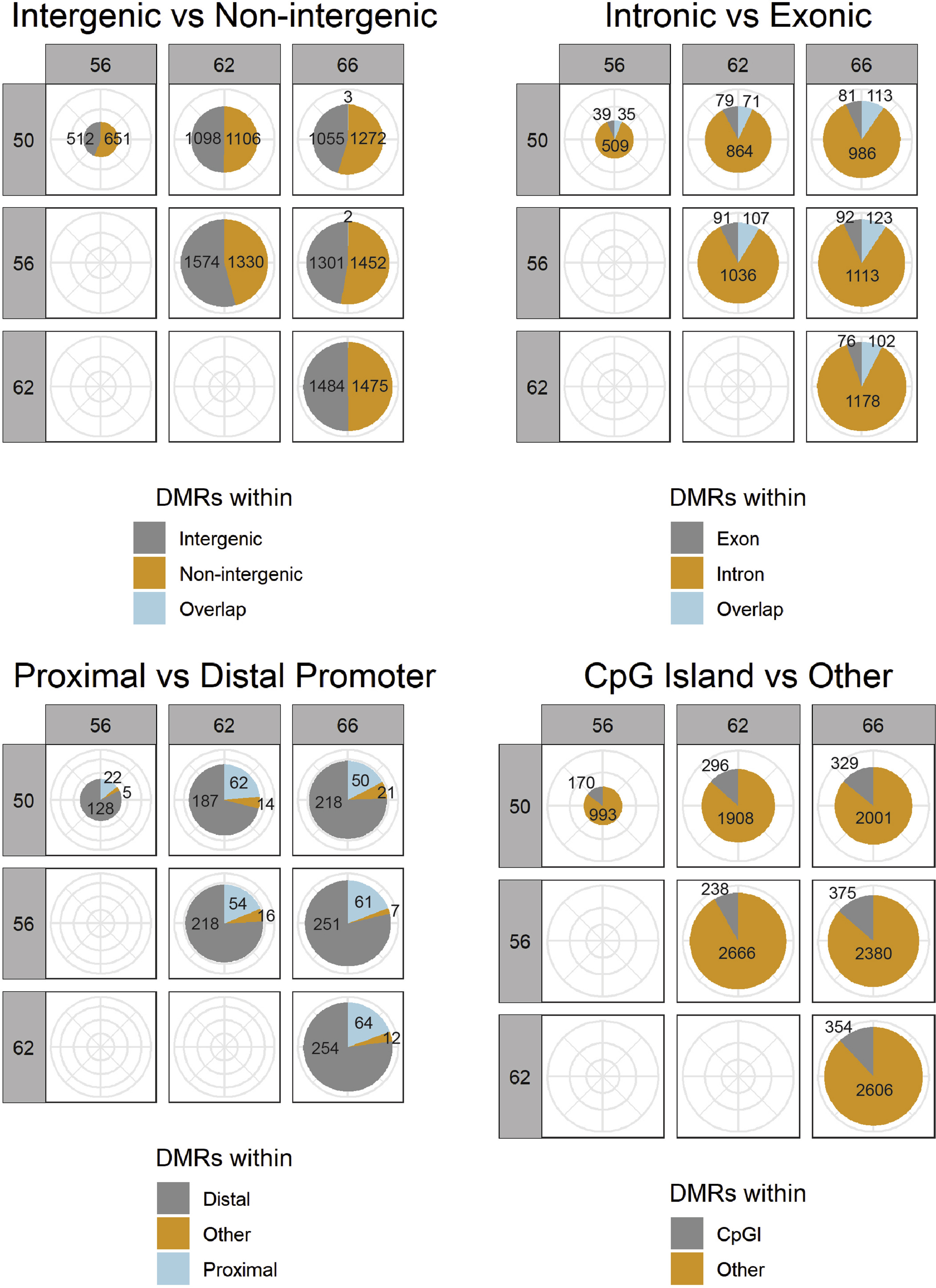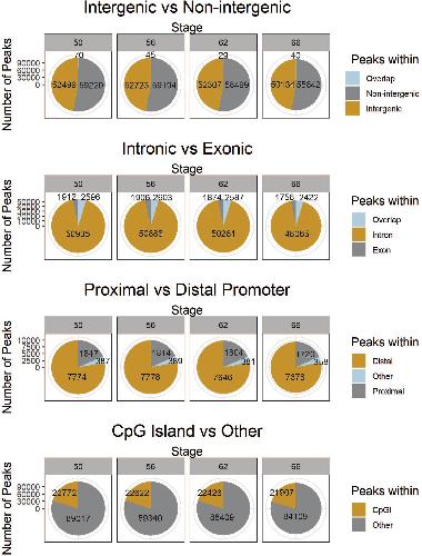 Supplemental Fig. 9. Distribution of differentially methylated regions (DMRs) among specific genomic features at four stages of metamorphosis. Shown are the number and relative proportion of intergenic vs intragenic, exonic vs intronic, promoter vs non-promoter, and CpG island vs non-CpG island DMRs for each pairwise stage comparison. For all pie charts, the area of the pie chart reflects the total number of DMRs identified. The numbers of DMRs within each category is also indicated. Differentially methylated regions were selected if ≥ 50% of the DMR was within the genomic feature. For the intergenic vs. intragenic and the exonic vs. intronic comparisons, rounding led to some DMRs not being counted, and these are labelled as “Other”. We did not see any differences in the relative distribution of DMRs among different genomic features during metamorphosis. |
