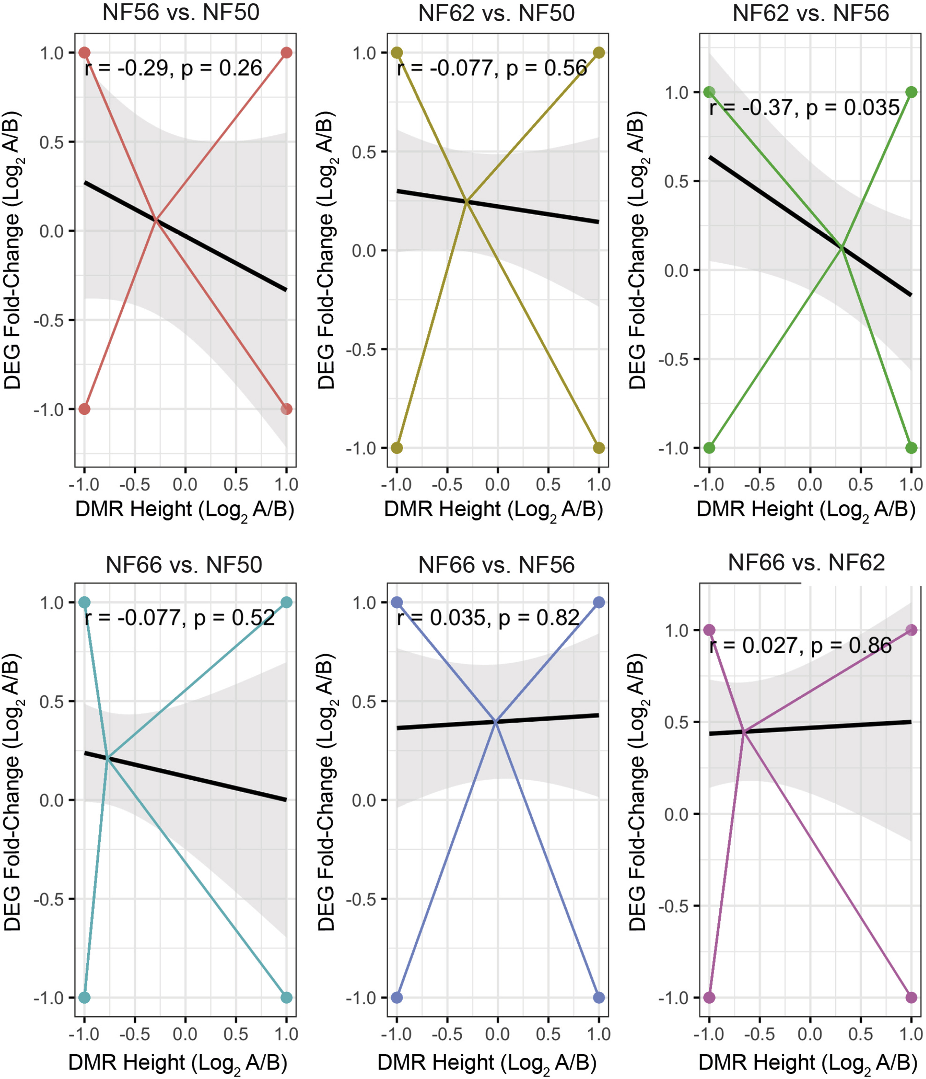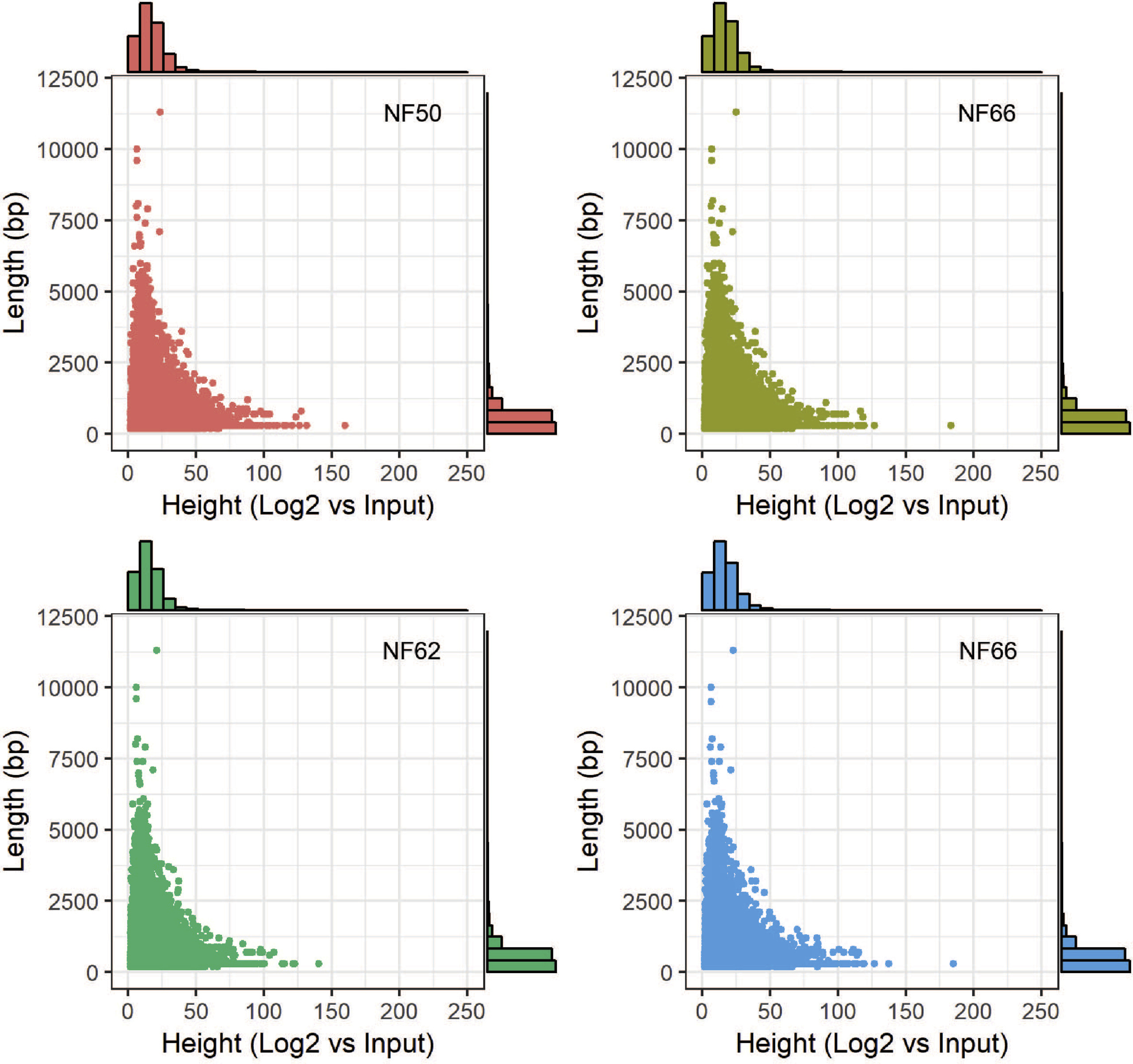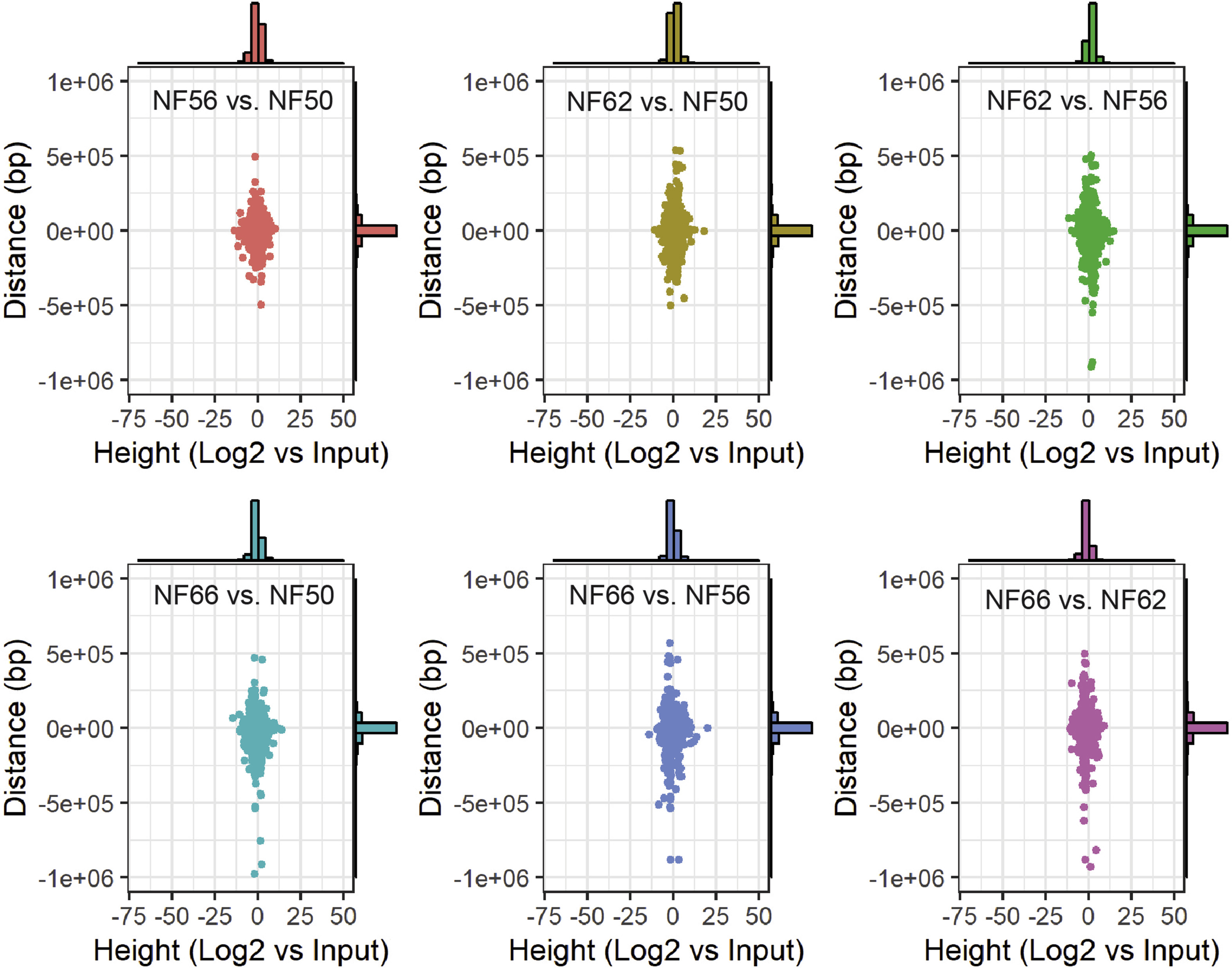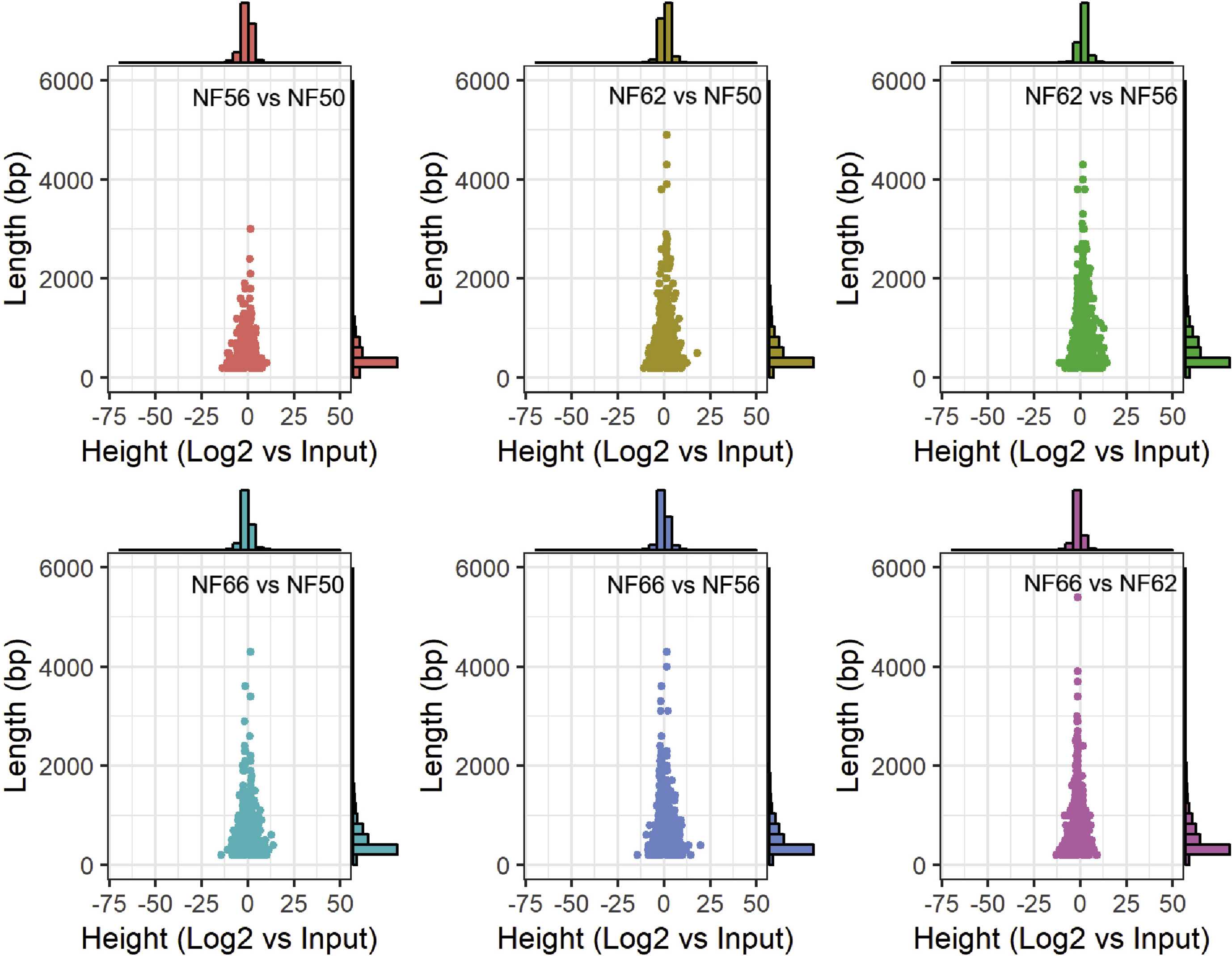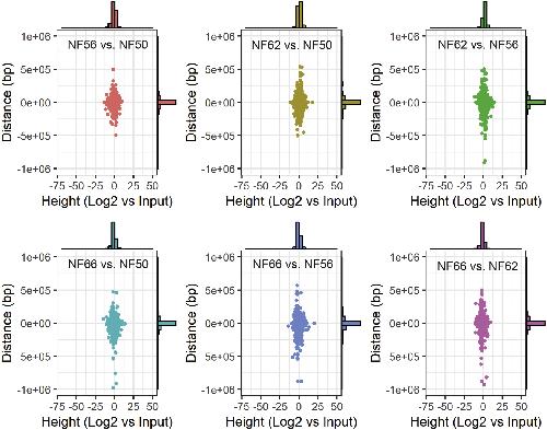 Supplemental Fig. 8. Comparisons of length and height of differentially methylated regions (DMRs) at six pairwise developmental stage comparisons. Shown are scatter plots with height (x-axis) and length (y-axis) of DMRs. Histograms showing the distribution of peak height and length are also shown. The DMR heights are log2 fold-height values of the first stage (A) relative to the second stage (B). For instance, a value of -2 means for a DMR in NF56 vs. NF50 means the DMR is log2-fold (or 4-fold) lower in NF56 than NF50, suggesting that demethylation occurred from NF50 to NF56 for that DMR. The lengths and heights of the DMRs are not very different between developmental stages; however, there is a shift in DMR height toward demethylation in the NF56 vs. NF50 comparison, methylation in the NF62 vs. NF56 comparison, and demethylation in the NF 66 vs. NF62 comparison as can be seen in the histograms at the top of each of these panels. |