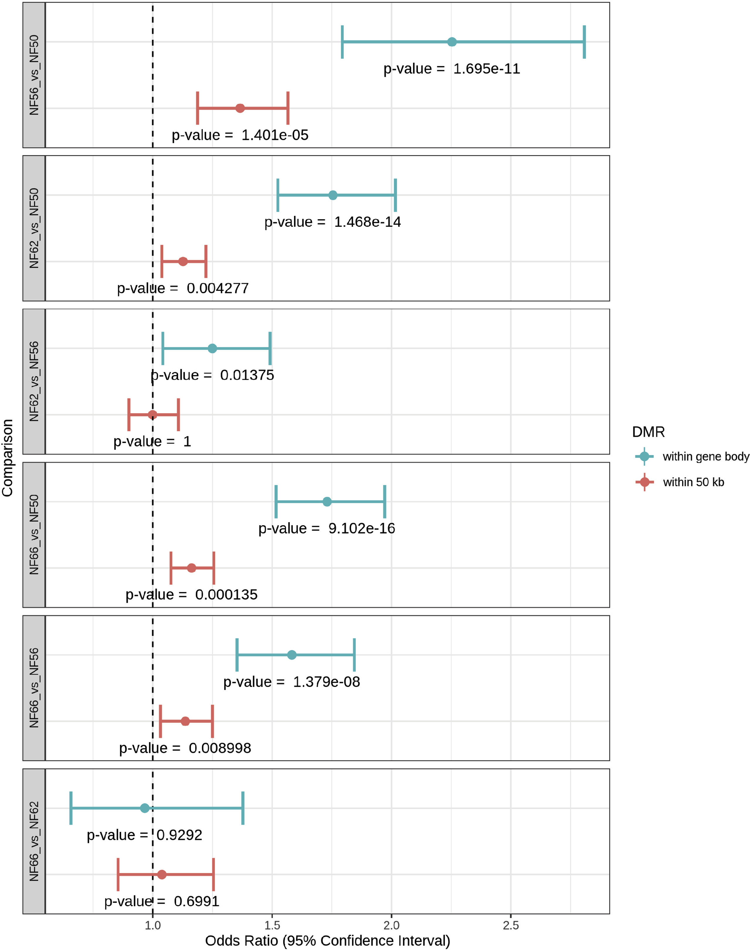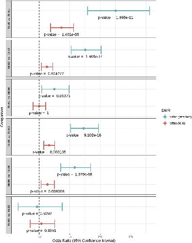 Supplemental Fig. 12. Differentially methylated regions (DMRs) are enriched within differentially expressed genes (DEGs). Forest plots showing the Odds Ratio and 95% Confidence Interval (x-axis) of a DMR being associated with a DEG relative to a non-DEG at six pairwise developmental stage comparisons (y-axis). Potential association was analyzed either within 50 kb of a gene (red) or within a gene body (blue/green). The associated p-values from the Fisher’s Exact Test are shown below each 95% Confidence Interval. An Odds Ratio of 1.5 suggests that a DMR is 1.5 times more likely to be associated with a DEG than a non-DEG. For each stage comparison, DMRs were enriched within 50 kb of DEGs vs. non-DEGs. The enrichment was greater if the DMR was within the gene-body. |