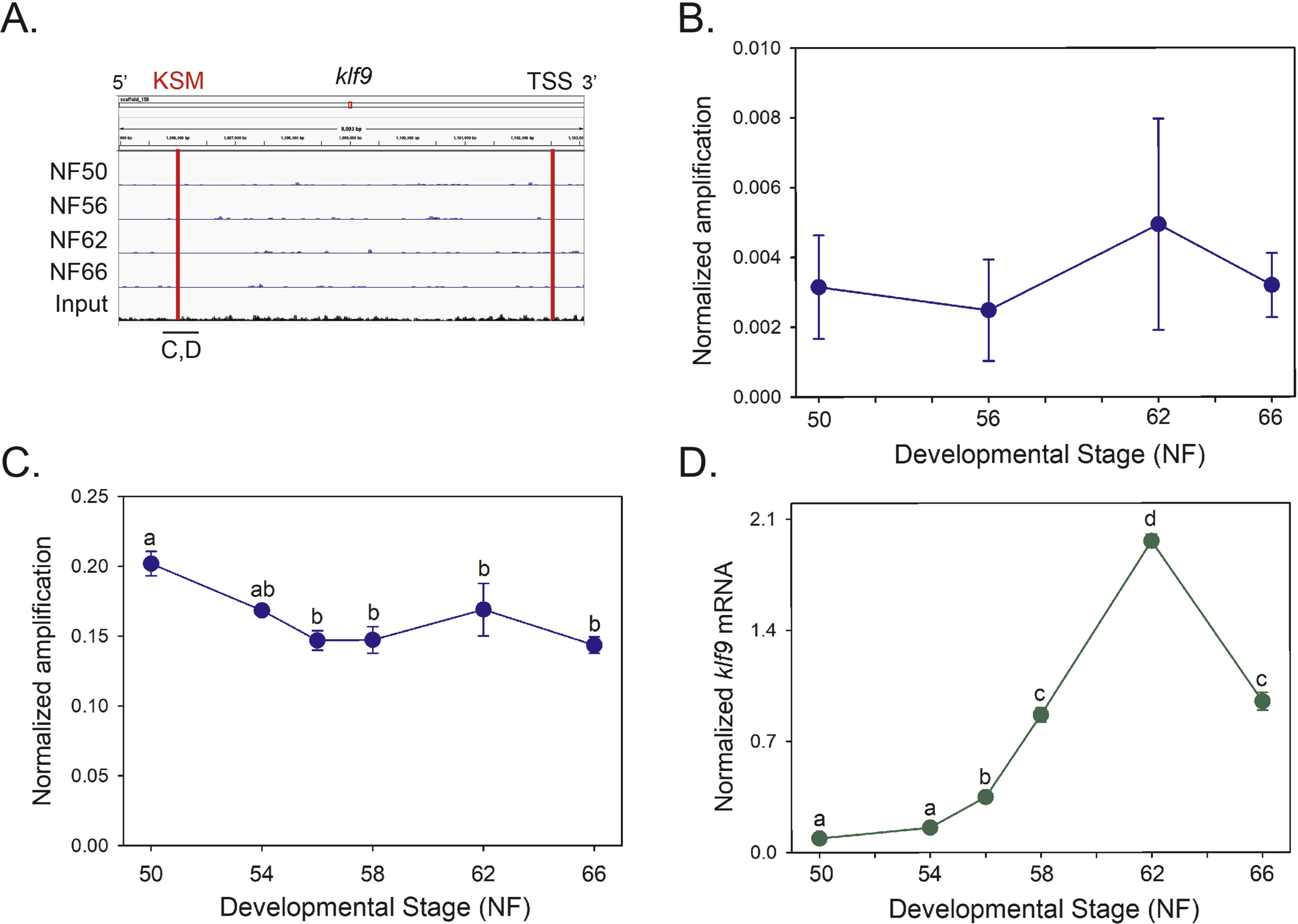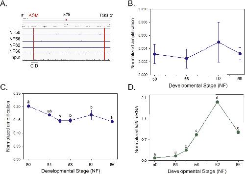 Supplemental Fig. 14. The klf9 gene is largely unmethylated in X. tropicalis tadpole brain during metamorphosis. Small but statistically significant DNA demethylation at the klf9 synergy module (KSM) correlates with the developmental increase in klf9 mRNA. The KSM is an ultraconserved, 180 bp region located 5-6 kb upstream of tetrapod klf9 genes that contains a DR+4 TRE and a glucocorticoid response element [2]. A. IGV genome browser tracks for MethylCap-seq data at the klf9 locus. The red lines indicate the locations of the KSM and the transcription start site (TSS). The black bar indicates the genomic region analyzed in panels B and C using targeted DNA methylation assays. Oligonucleotide primer sequences are given in Supplemental Table 1. B. We conducted MethylCap assay targeting the KSM region. Points represent the mean+SEM of the normalized PCR amplification signal (normalized to the input). There were no statistically significant differences in the MethylCap signal among stages of metamorphosis (ANOVA). C. We conducted methylation-sensitive restriction digest/qPCR (chop-qPCR) assays targeting the KSM. Points represent the mean+SEM (n=5/developmental stage) of the normalized PCR amplification signal (normalized to the quantity of the amplicon from a neighboring genomic region that did not contain restriction sites). Means with the same letter are not significantly different (F(5,18) = 9.847, p < 0.001; ANOVA; n=4/developmental stage). D. We measured klf9 mRNA in X. tropicalis tadpole brain during metamorphosis using real-time RTqPCR. We normalized klf9 mRNA to the reference gene alpha-actinin, whose mRNA level did not during metamorphosis (data not shown). Points represent the mean+ SEM (n=5/developmental stage), and means with the same letter are not significantly different (F(5,23) = 419.359, p < 0.001; ANOVA). |